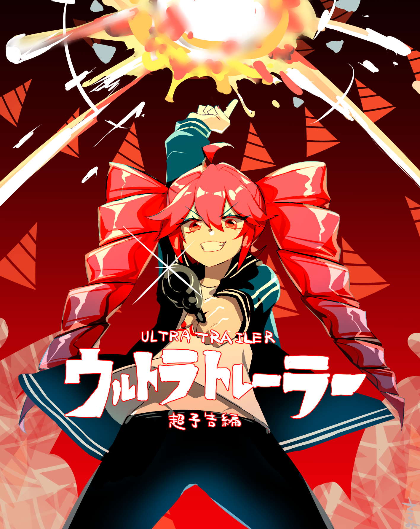 1girl ahoge alternate_costume aqua_jacket arm_up black_pants cowboy_shot double-parted_bangs drill_hair explosion grin groin gun hair_between_eyes highres holding holding_gun holding_weapon index_finger_raised jacket kasane_teto kasane_teto_(sv) long_hair open_clothes open_jacket pants red_background red_eyes red_hair shirt smile solo synthesizer_v torino_sasami twin_drills ultra_trailer_(synthesizer_v) utau weapon white_shirt white_trim