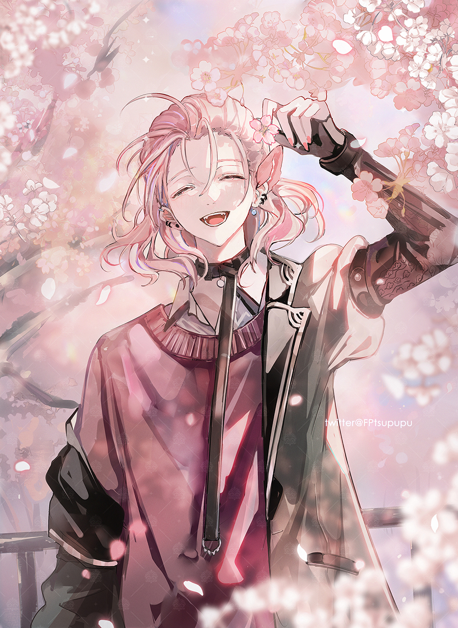 1boy arm_up belt belt_necktie bishounen cherry_blossoms choker closed_eyes collared_shirt ear_piercing earrings falling_petals flower highres holding holding_flower jacket jewelry kurayuki0404 long_sleeves looking_at_viewer male_focus murakumo_gou off_shoulder open_mouth outdoors petals piercing pink_hair pink_theme purple_sweater_vest shirt smile solo sweater_vest teeth touken_ranbu tree upper_body wavy_hair white_shirt