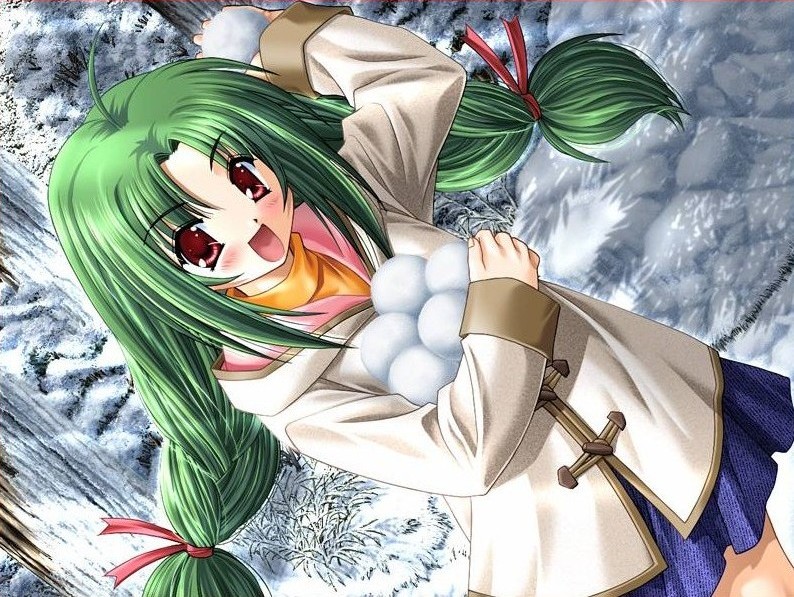 1girl blush coat day dot_nose female_focus game_cg green_eyes hiyorigawa_asahi holding holding_snowball long_hair long_sleeves looking_at_viewer open_mouth outdoors red_eyes snow snow_(game) snowball winter
