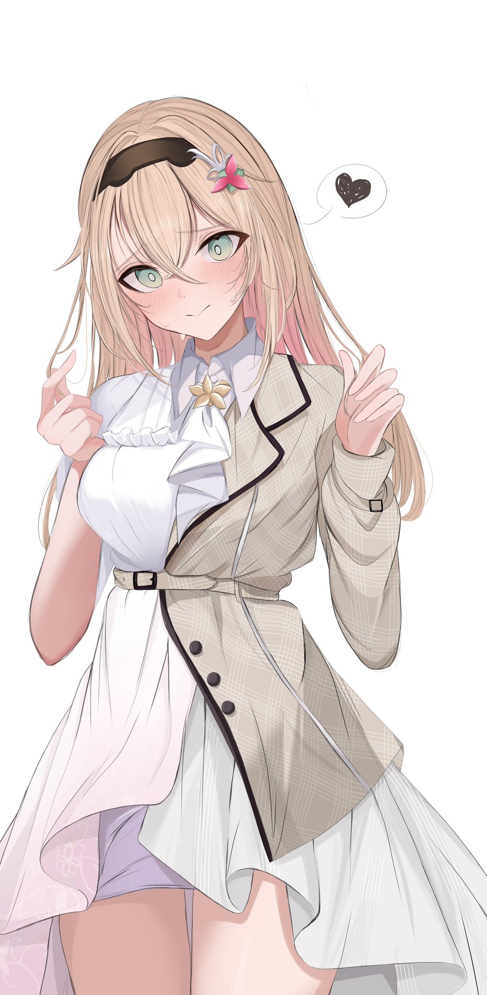 1girl alternate_hair_length alternate_hairstyle ascot asymmetrical_sleeves azki_(4th_costume)_(hololive) azki_(hololive) azki_(hololive)_(cosplay) black_hairband blonde_hair blush bright_pupils brown_jacket collared_dress commentary_request cosplay cowboy_shot dress embarrassed finger_heart gradient_clothes gradient_dress green_eyes grey_dress h0tarukaki hair_ornament hairband hairclip heart high-low_dress high-low_skirt highres hololive jacket kazama_iroha long_hair looking_at_viewer nervous_sweating pink_dress ringed_eyes simple_background skirt skirt_under_dress solo spoken_heart striped_clothes striped_dress sweat uneven_sleeves vertical-striped_clothes vertical-striped_dress very_sweaty virtual_youtuber white_ascot white_background white_dress white_pupils white_skirt