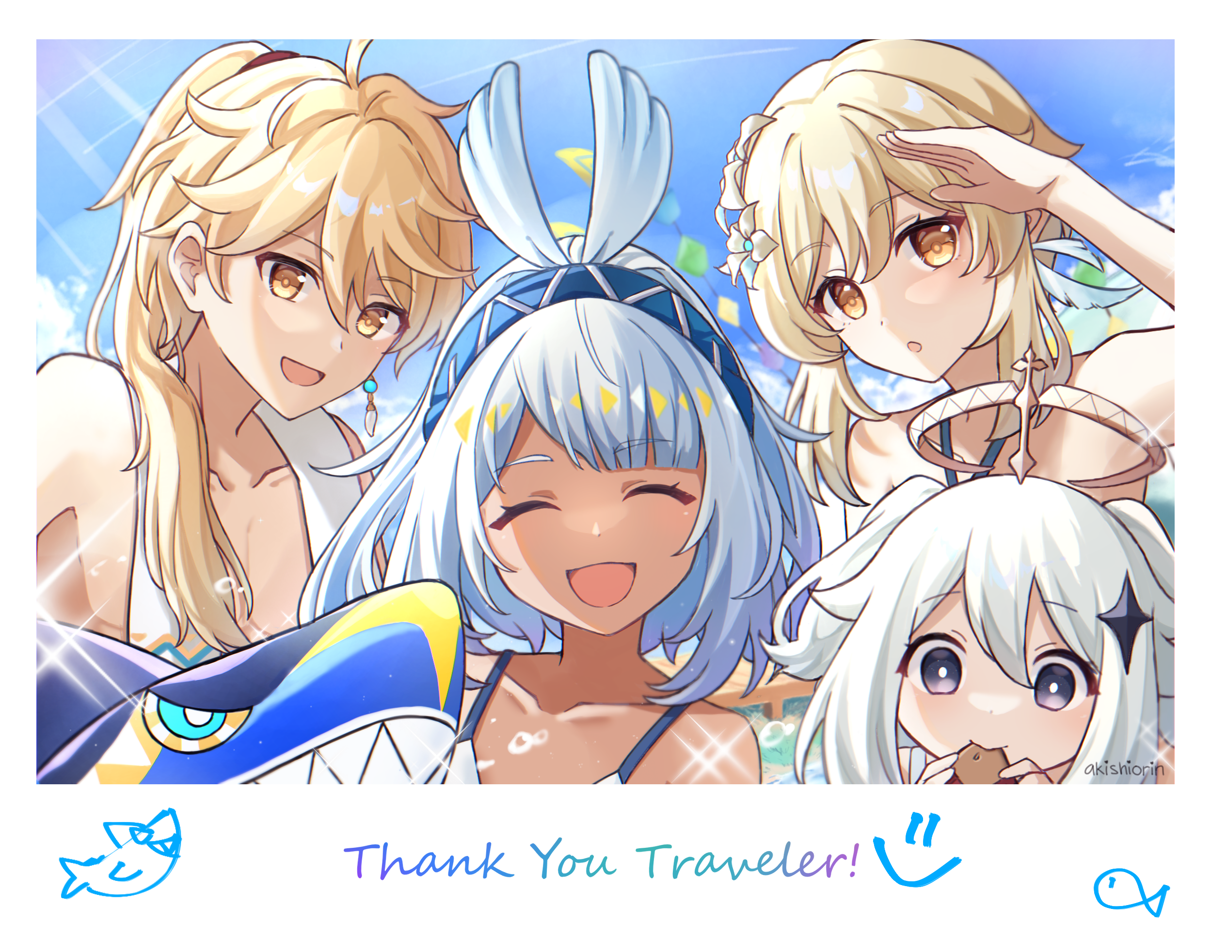 1boy 3girls aether_(genshin_impact) aether_(hot_springs)_(genshin_impact) akishiorin artist_name bare_shoulders blonde_hair blue_hair blue_hairband blue_sky brother_and_sister closed_eyes commentary dark-skinned_female dark_skin day earrings eating english_commentary english_text fake_photograph feather_hair_ornament feathers flower genshin_impact hair_flower hair_ornament hairband halo hand_up highres jewelry long_hair looking_at_viewer lumine_(genshin_impact) lumine_(hot_springs)_(genshin_impact) mualani_(genshin_impact) mualani_(hot_springs)_(genshin_impact) multiple_girls open_mouth outdoors paimon_(genshin_impact) paimon_(hot_springs)_(genshin_impact) ponytail portrait purple_eyes siblings single_earring sky smile sunlight towel towel_around_neck twins white_hair