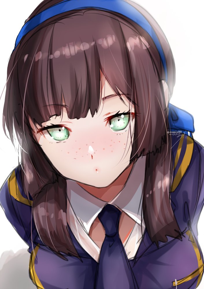 1girl blue_hairband blue_ribbon blush brown_hair commentary_request eyelashes freckles green_eyes hair_ribbon hairband jacket kantai_collection kimura_shiki looking_at_viewer mogador_(kancolle) necktie puckered_lips purple_jacket purple_necktie ribbon signature simple_background solo twitter_username upper_body white_background