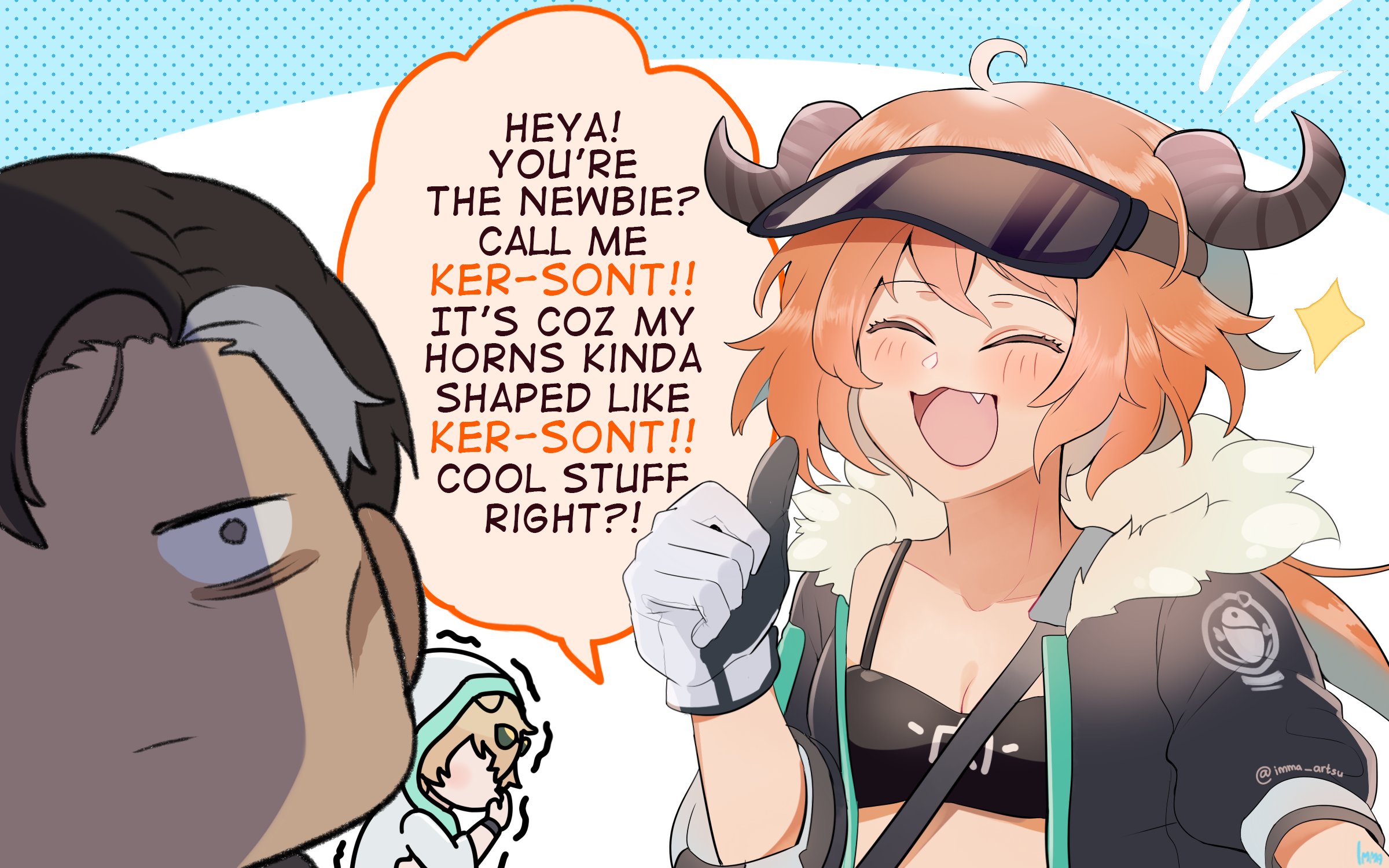 1girl 2boys arknights bags_under_eyes black_hair blonde_hair blush cow_girl cow_horns croissant_(arknights) crossover doc_(rainbow_six_siege) english_text giggling gloves happy highres horns imma_artsu multicolored_hair multiple_boys orange_hair penguin_logistics_logo rainbow_six_siege shaded_face speech_bubble streaked_hair tequila_(arknights) thumbs_up white_hair