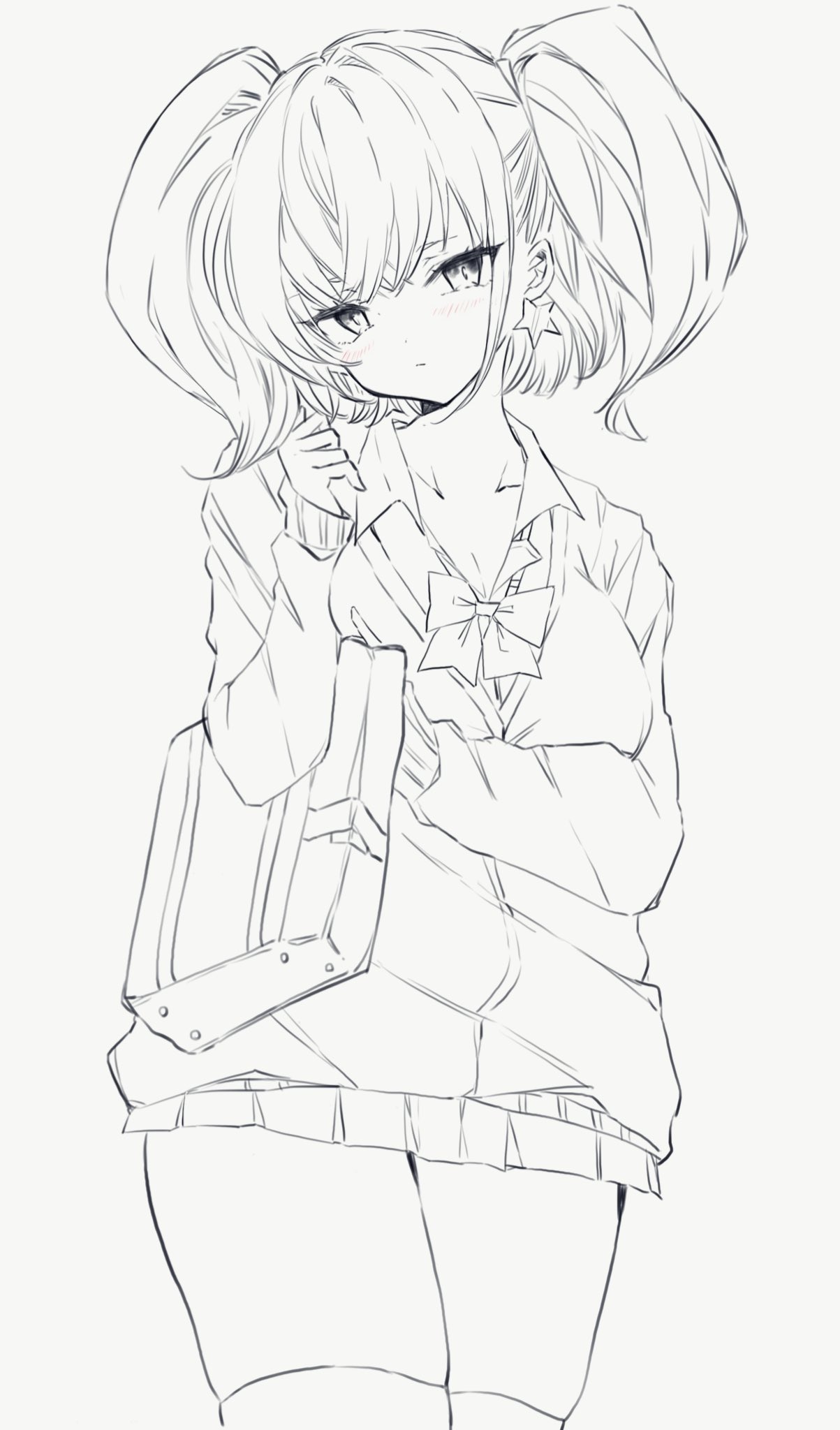 1girl alternate_costume atlanta_(kancolle) bag blazer bow bowtie chigasaki_yukari collared_shirt cowboy_shot earrings highres jacket jewelry kantai_collection lineart long_hair looking_at_viewer pleated_skirt school_bag school_uniform shirt single_earring skirt solo star_(symbol) star_earrings two_side_up