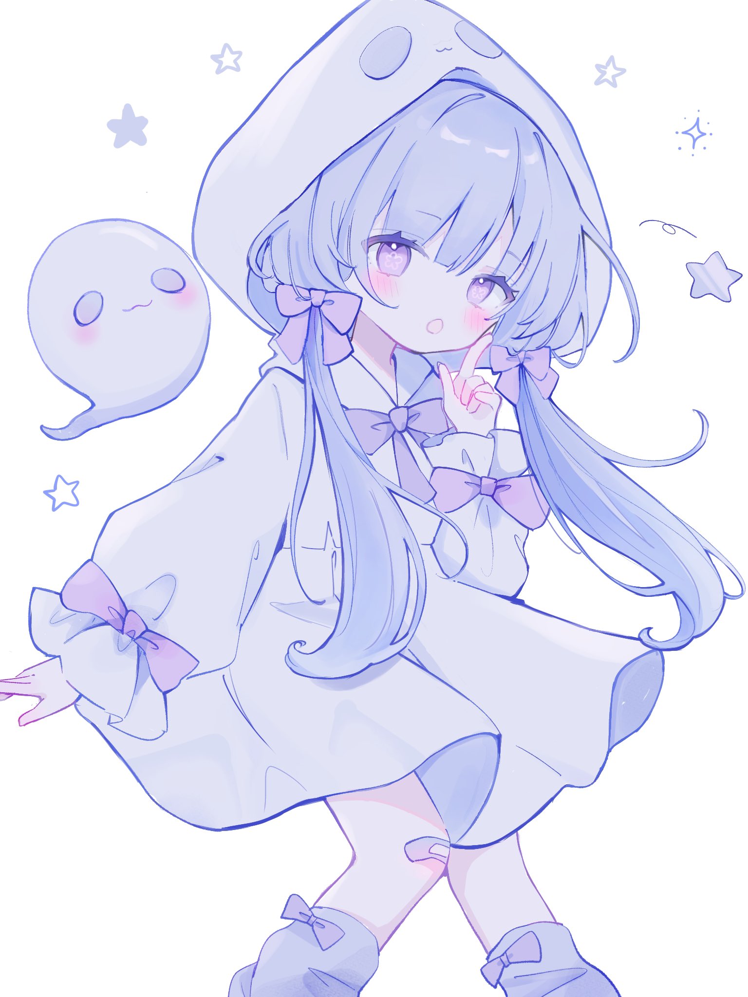 1girl :3 bandaid bandaid_on_leg blue_hair blush bow bowtie child commentary_request flower-shaped_pupils ghost hair_bow highres index_finger_raised indie_virtual_youtuber iro_iro_iroo light_blue_hair long_hair long_skirt long_sleeves looking_at_viewer obake_no_nenene open_mouth puffy_long_sleeves puffy_sleeves purple_bow purple_bowtie purple_eyes shirt simple_background skirt solo sparkle star_(symbol) symbol-shaped_pupils twintails very_long_hair virtual_youtuber white_background white_hood white_shirt white_skirt