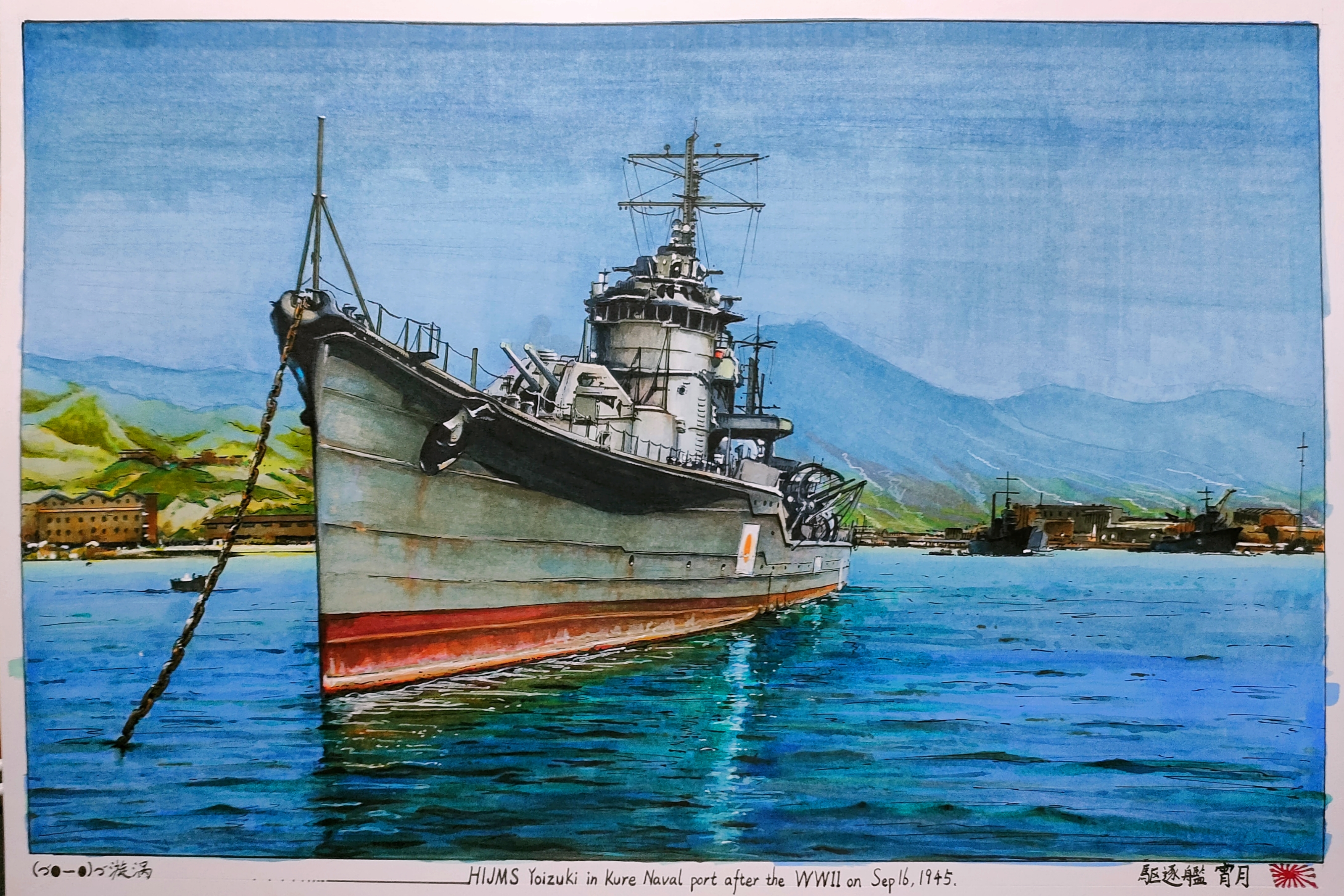 cannon destroyer english_text highres imperial_japanese_navy military_vehicle mountain ocean original photo-referenced port scenery ship ship_turret vehicle_name vortex_(xu_xuanwo) warship watercraft yoizuki_(destroyer)