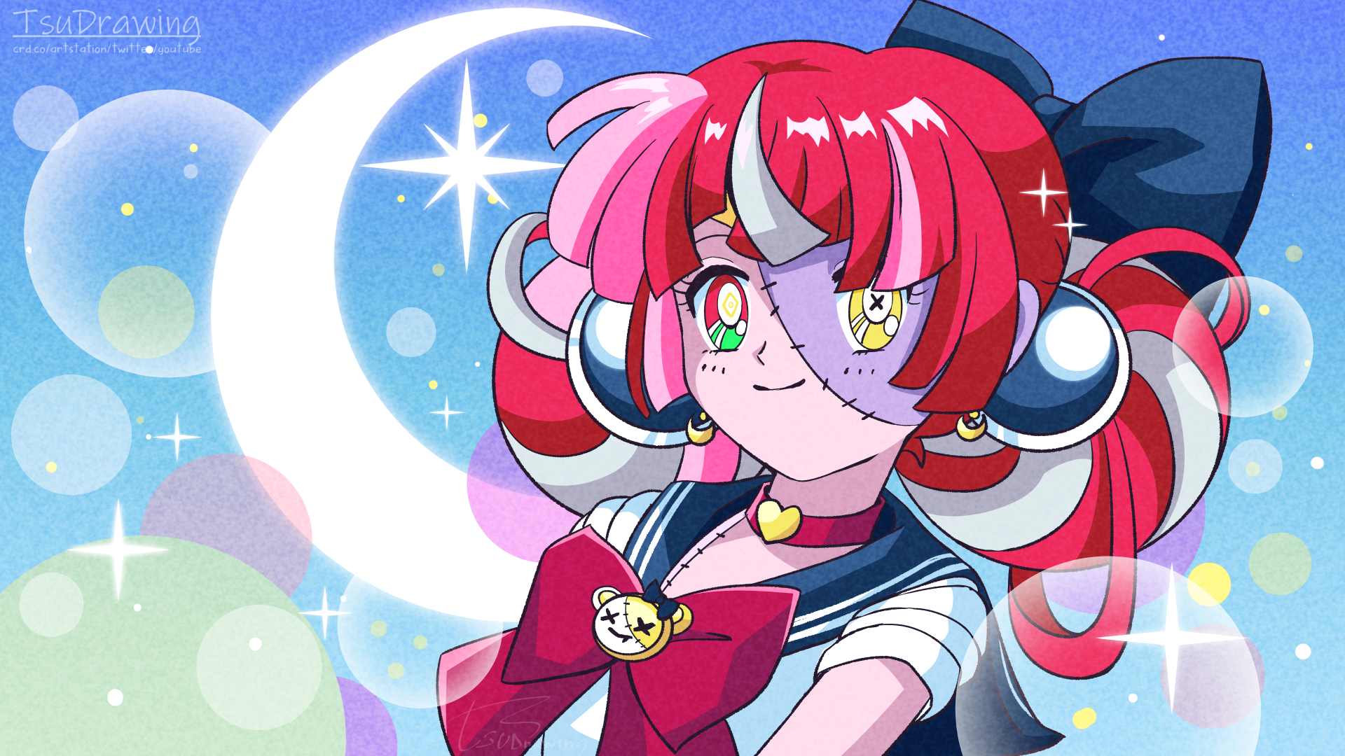 1990s_(style) 1girl artist_name bishoujo_senshi_sailor_moon blue_bow blue_bowtie blue_sailor_collar bow bowtie choker colored_sclera colored_skin commentary crescent crescent_earrings cross-shaped_pupils diamond-shaped_pupils diamond_(shape) double_bun earrings eyelashes hair_bun heart heart_choker heterochromia highres hololive hololive_indonesia jewelry kureiji_ollie looking_at_viewer mismatched_sclera multicolored_hair parody red_bow red_bowtie red_choker red_hair red_sclera retro_artstyle sailor_collar sailor_senshi_uniform smile solo stitches streaked_hair style_parody symbol-shaped_pupils tsukidraws two-tone_hair upper_body virtual_youtuber white_hair yellow_sclera