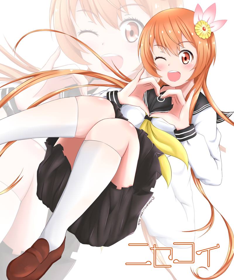 1girl ;d blush breasts brown_eyes brown_footwear brown_hair flower hair_flower hair_ornament heart heart_hands kneehighs long_hair looking_at_viewer medium_breasts nisekoi one_eye_closed open_mouth saturdaylife school_uniform serafuku shirt sidelocks skirt smile socks solo tachibana_marika teeth upper_teeth_only