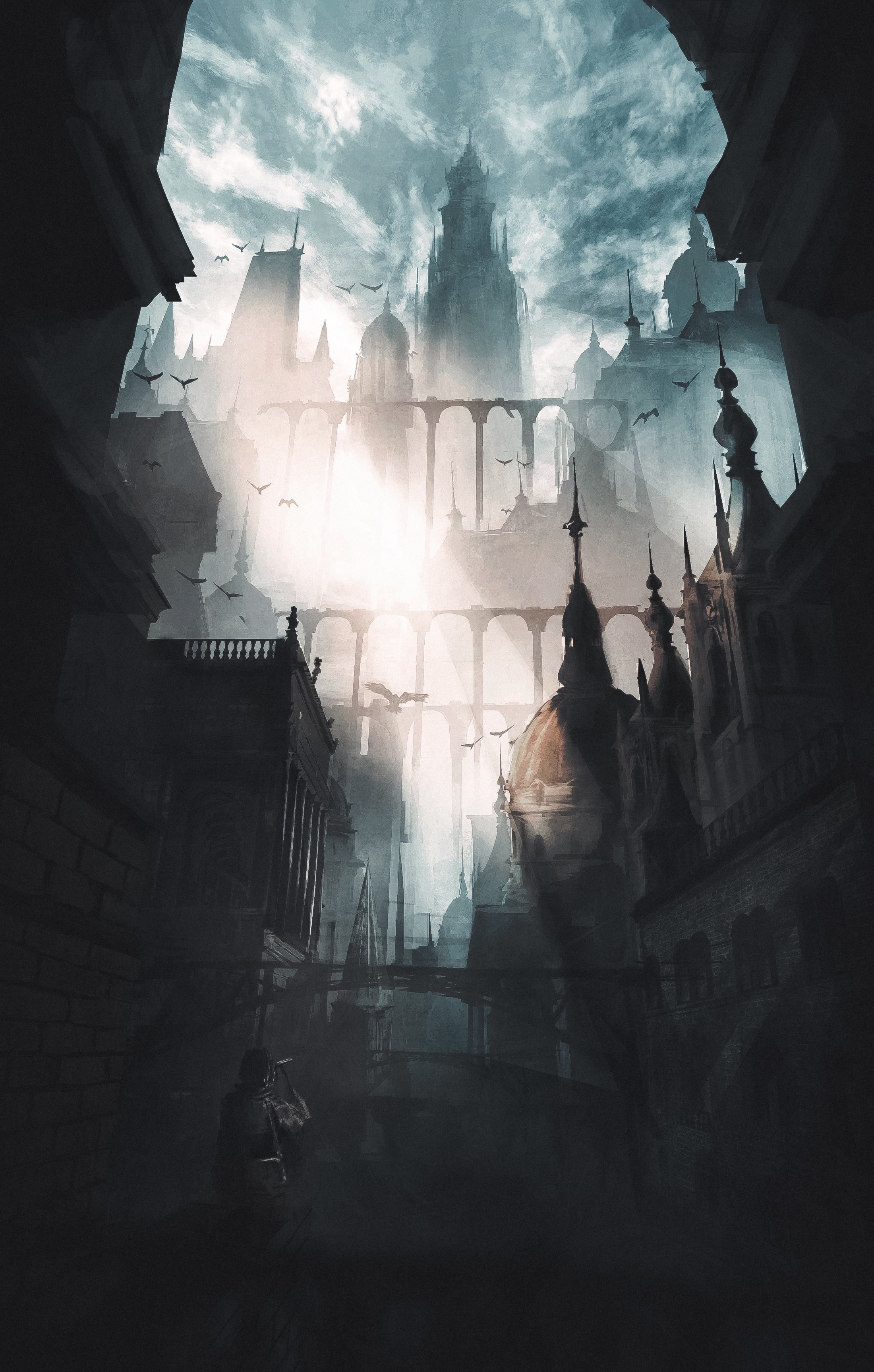 1other absurdres an_yomogi arch architecture bird bridge city cloud cloudy_sky dark dawn dome fantasy fog highres holding holding_telescope light_rays original overcast scenery sky spire sunlight telescope tower