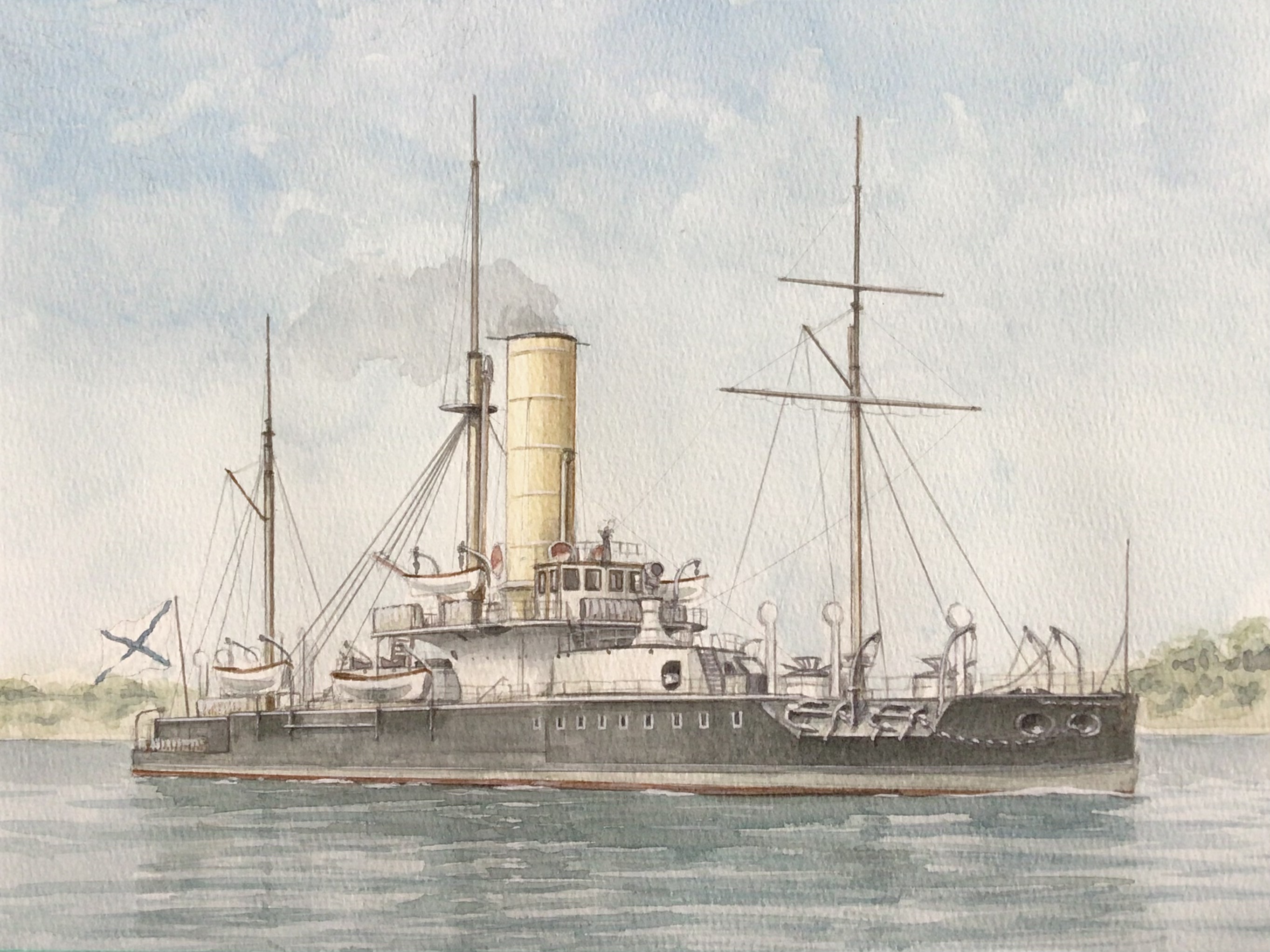 atelier_bono cannon highres imperial_russian_navy ironclad military_vehicle no_humans ocean original painting_(medium) petr_veliky_(1872) port ship ship_turret smokestack traditional_media vehicle_focus warship watercolor_(medium) watercraft
