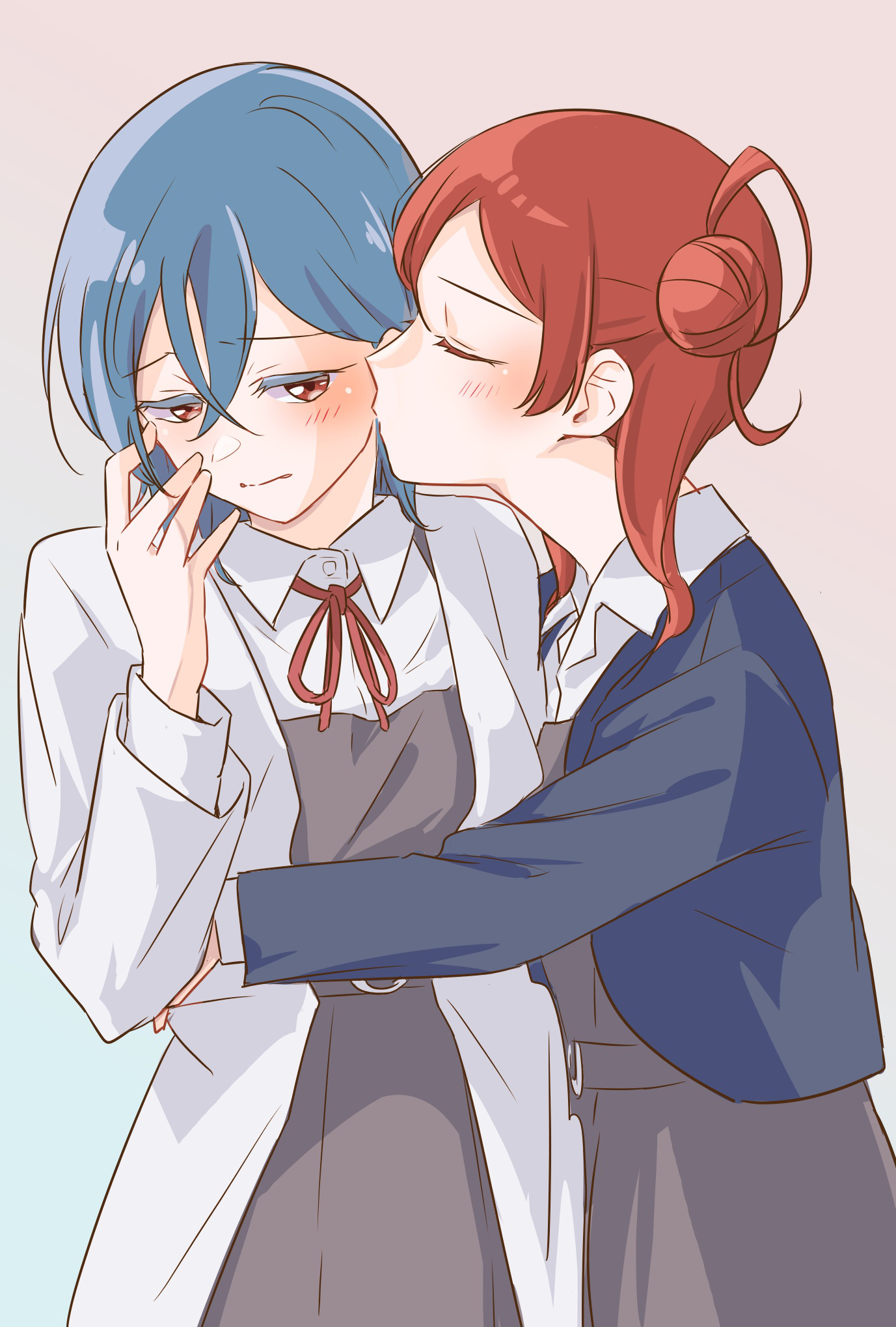 2girls blue_hair blush closed_eyes hair_between_eyes hair_bun hand_on_own_face highres hug kikorinolily kiss kissing_cheek long_sleeves love_live! love_live!_superstar!! multiple_girls red_eyes red_hair school_uniform short_hair single_side_bun wakana_shiki yoneme_mei yuigaoka_school_uniform yuri