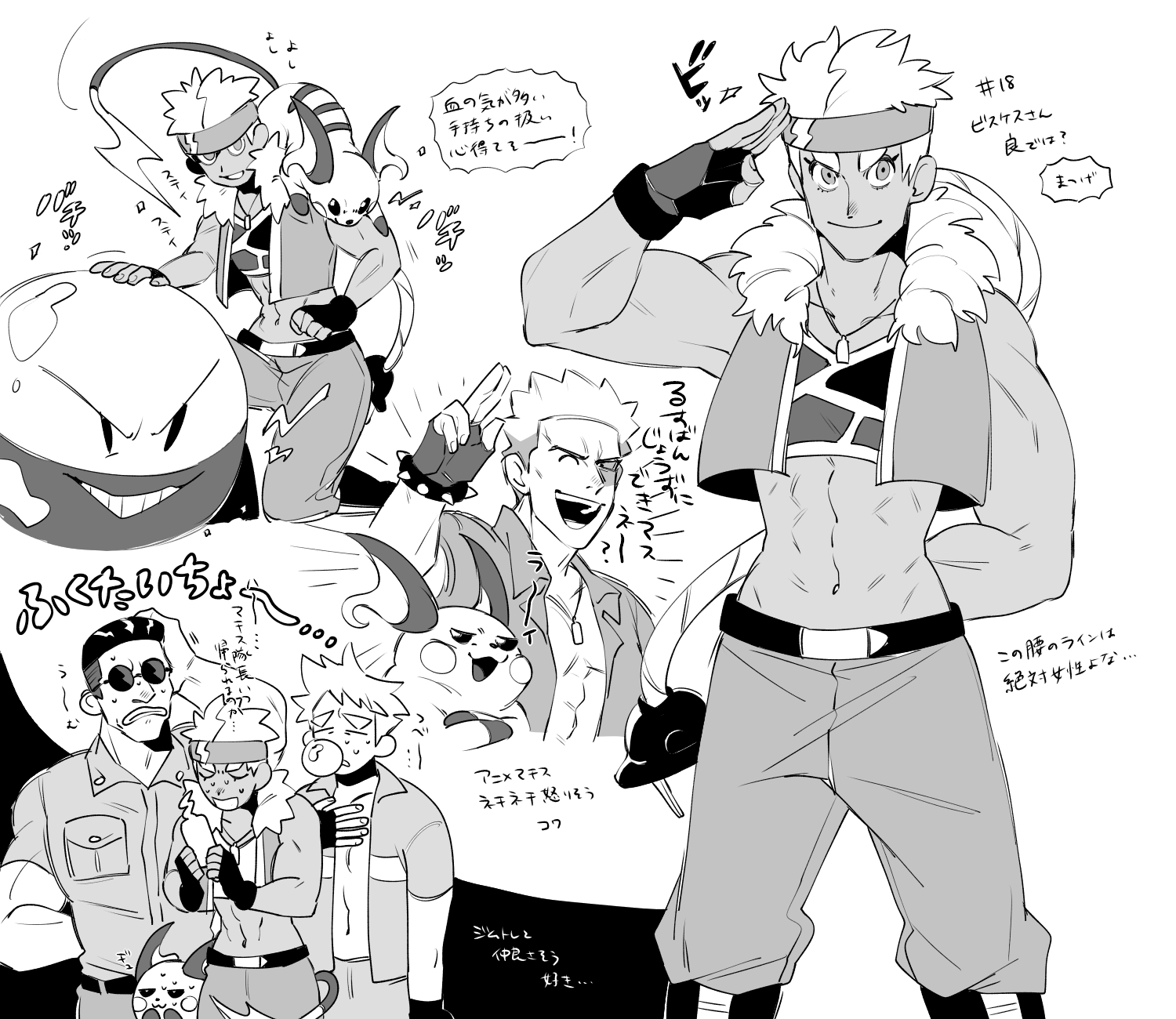 1girl 3boys abs bubblegumbomb dark-skinned_female dark_skin dog_tags electrical_outlet electrode_(pokemon) fingerless_gloves gen_1_pokemon gen_4_pokemon gloves gym_leader headband highres jacket long_hair military military_jacket military_uniform multiple_boys muscular muscular_arms muscular_female nintendo pokemon pokemon_(anime) pokemon_journeys ponytail raichu rotom rotom_phone ryokutya1107 salute sports_bra steve_(pokemon) lt._surge thick_eyebrows tomboy tony_(pokemon) very_long_hair vest visquez_(pokemon)