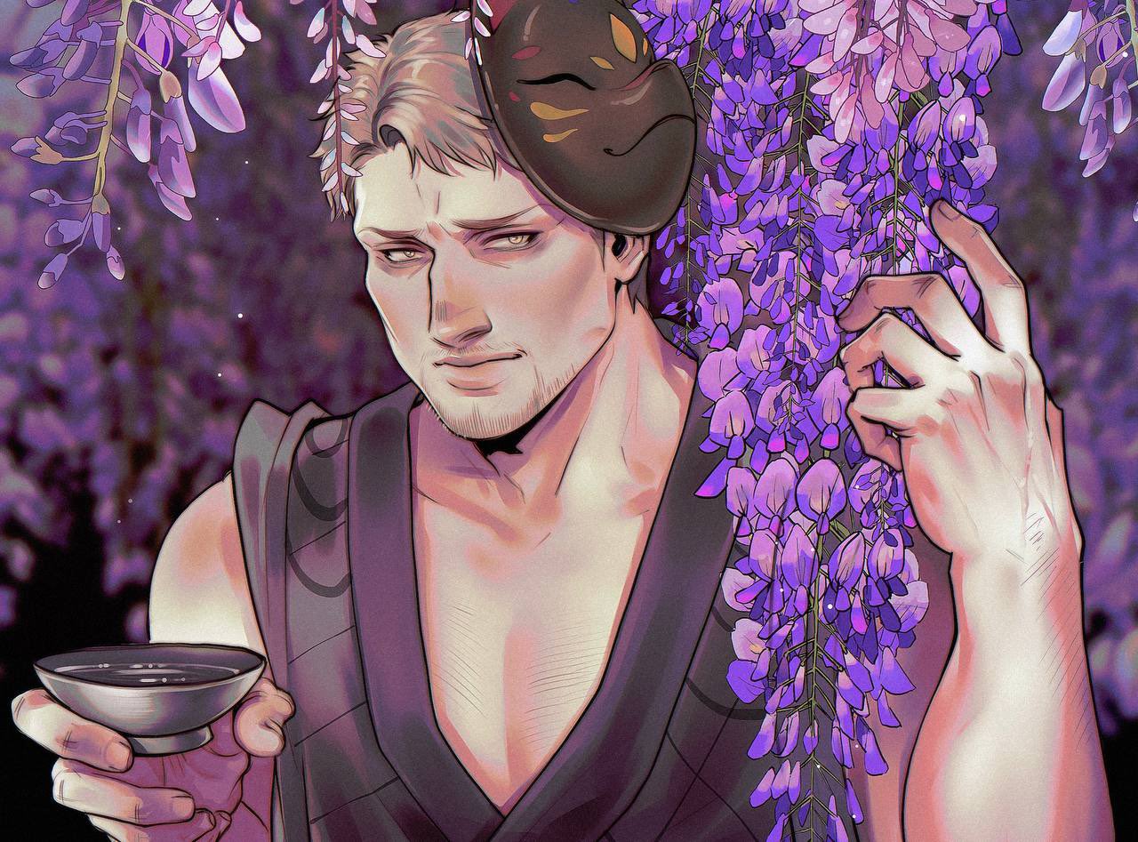 1boy arm_hair arms_up bare_shoulders beard_stubble black_kimono black_mask blonde_hair collarbone cup curled_fingers facial_hair flower fox_mask holding holding_cup japanese_clothes kimono male_focus mask mask_on_head pectoral_cleavage pectorals purple_flower reiner_braun sakazuki shingeki_no_kyojin sleeveless sleeveless_kimono solo stubble tirajpg upper_body yellow_eyes