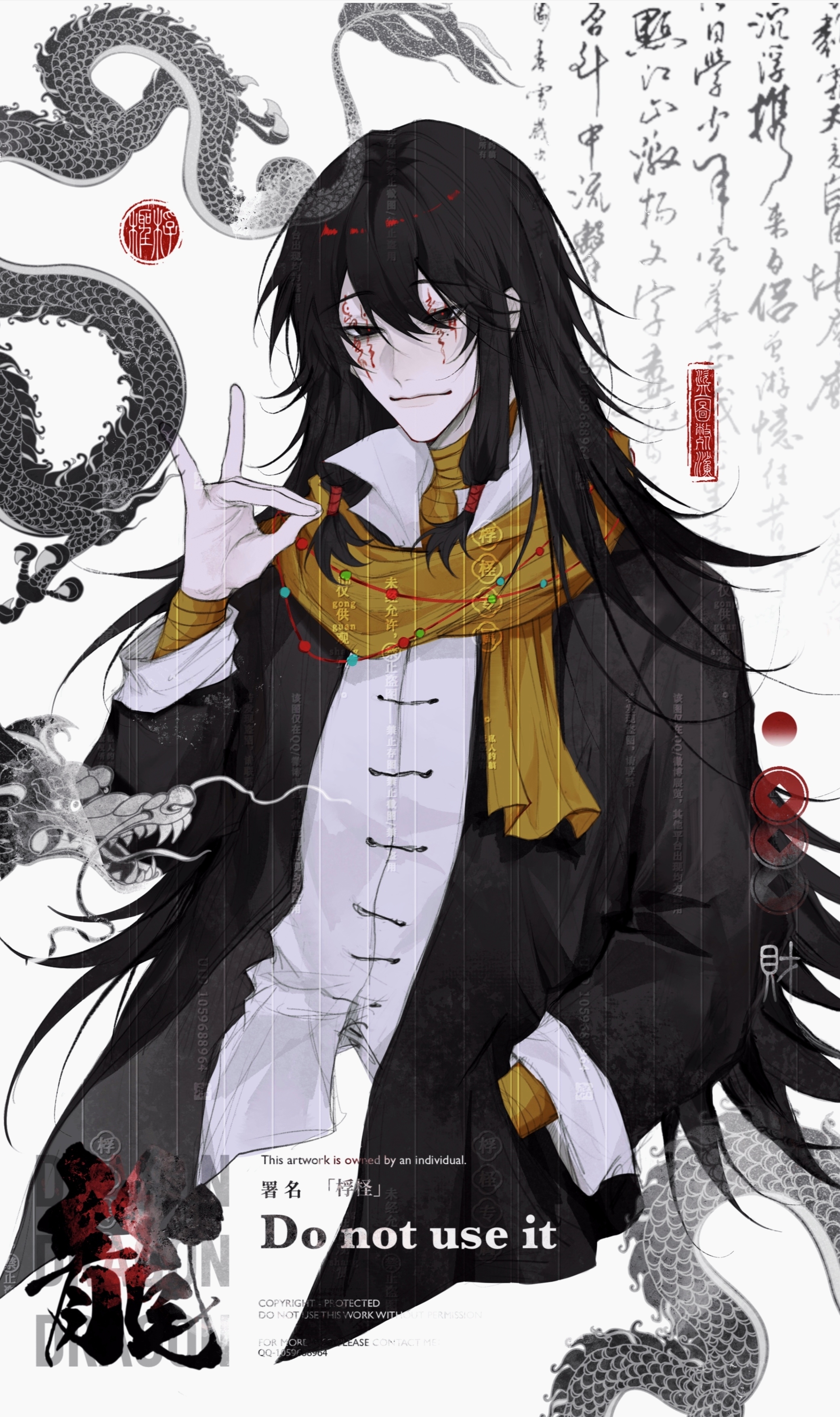 1boy absurdres bandaged_arm bandaged_neck bandages black_eyes black_hair black_jacket chinese_commentary commentary_request commission cropped_torso facial_tattoo fox_shadow_puppet fucheng624 hair_between_eyes hand_in_pocket hand_up highres jacket long_hair low-tied_sidelocks male_focus mole mole_under_eye open_clothes open_jacket procreate_(medium) red_pupils scarf shirt sidelocks solo tattoo too_many_watermarks touqi_guaitan watermark white_shirt yellow_scarf ziche_fuzhao