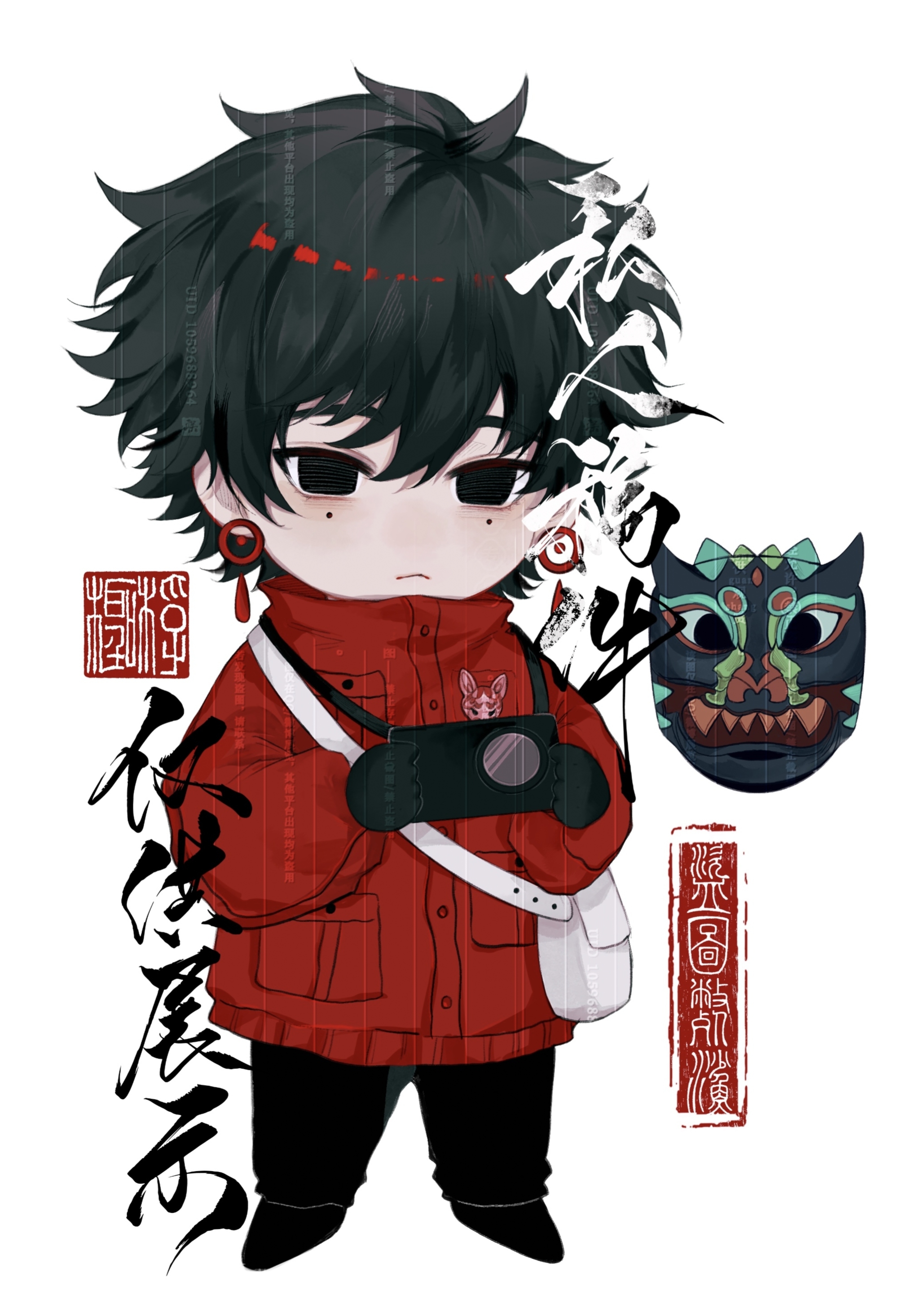 1boy absurdres bag black_eyes black_gloves black_hair black_pants camera camera_around_neck chibi chibi_only chinese_commentary closed_mouth commentary_request commission earrings fucheng624 gloves hair_between_eyes high_collar highres jacket jewelry li_yuting_(male) long_sleeves male_focus messenger_bag mole mole_under_each_eye mole_under_eye multiple_moles pants procreate_(medium) red_jacket short_hair shoulder_bag solo too_many_watermarks touqi_guaitan watermark white_background white_bag