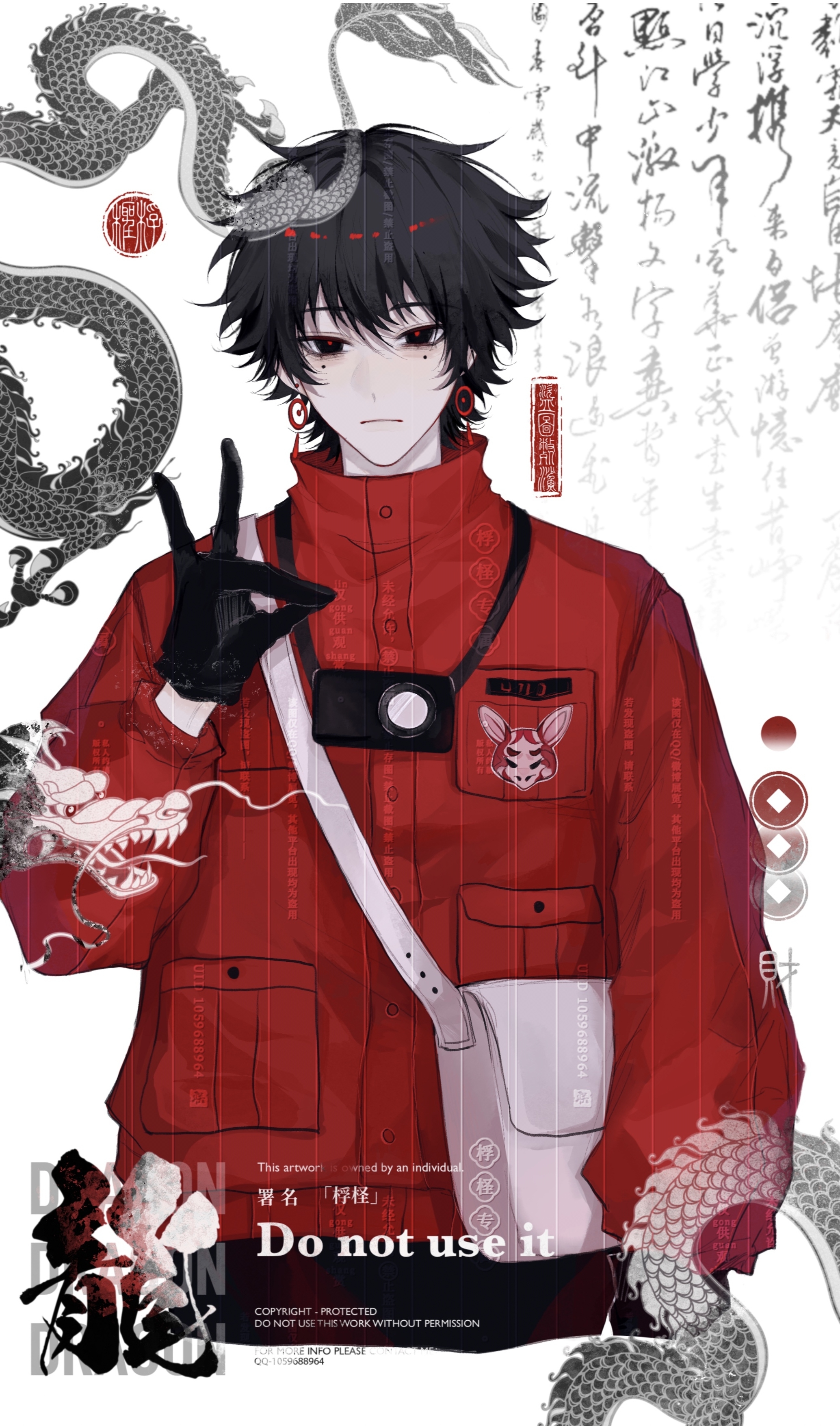 1boy absurdres bag black_eyes black_gloves black_hair black_pants camera camera_around_neck chinese_commentary closed_mouth commentary_request commission cropped_torso earrings fox_shadow_puppet frown fucheng624 gloves hand_up high_collar highres jacket jewelry li_yuting_(male) long_sleeves male_focus messenger_bag mole mole_under_each_eye mole_under_eye multiple_moles pants procreate_(medium) red_jacket short_hair shoulder_bag solo too_many_watermarks touqi_guaitan watermark white_bag
