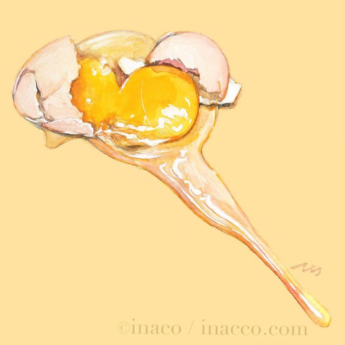 artist_name commentary_request egg_(food) egg_yolk eggshell food food_focus inaco no_humans original painting_(medium) signature simple_background still_life traditional_media watercolor_(medium) yellow_background