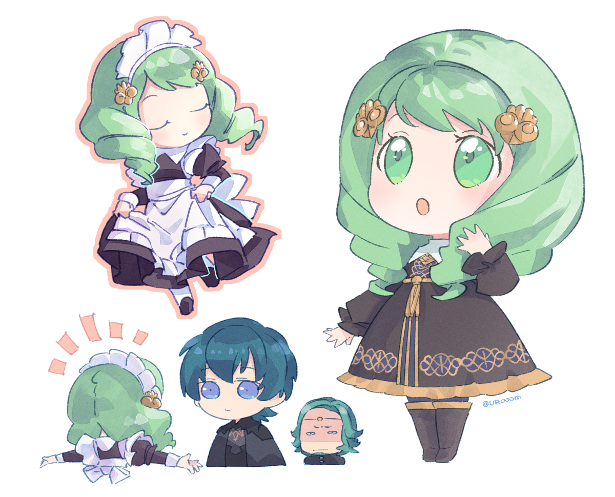 1girl 2boys alternate_costume byleth_(fire_emblem) drill_hair facial_hair fire_emblem fire_emblem:_three_houses flayn_(fire_emblem) garreg_mach_monastery_uniform green_eyes green_facial_hair green_hair long_hair maid male_byleth_(fire_emblem) multiple_boys nintendo seteth_(fire_emblem) twin_drills urooom
