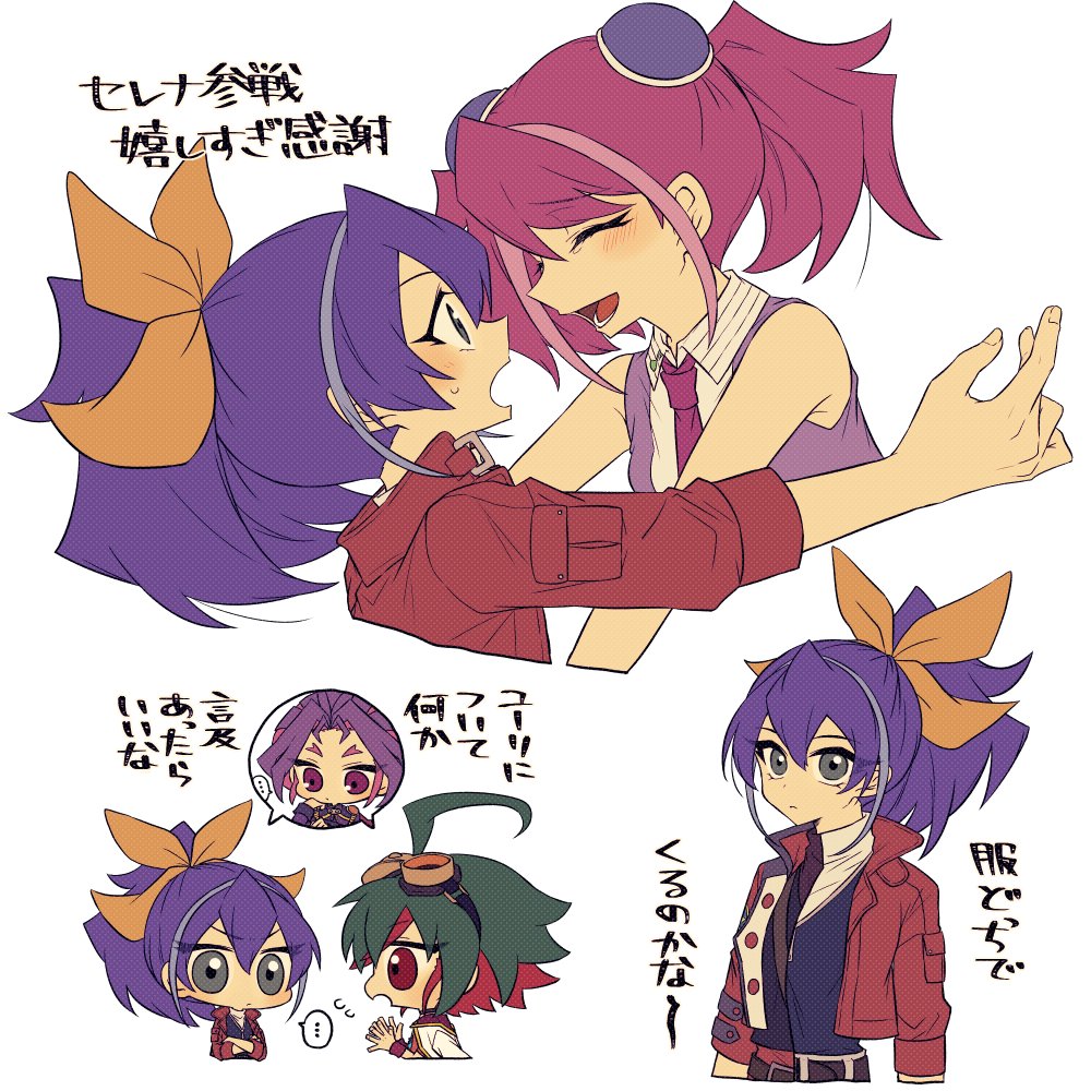 ... 2boys 2girls ahoge bare_shoulders blush bow closed_mouth commentary_request crossed_arms dress goggles goggles_on_head grey_eyes grey_hair hair_bow hair_ornament hiiragi_yuzu huge_ahoge jacket joeri_(yu-gi-oh!) long_hair lower_teeth_only multiple_boys multiple_girls multiple_views open_clothes open_jacket open_mouth pink_hair ponytail purple_eyes purple_hair red_eyes red_hair red_jacket sakaki_yuya serena_(yu-gi-oh!) short_hair sleeveless sleeveless_dress spoken_ellipsis sweatdrop teeth tkgmgmgmg translation_request twintails upper_body white_background yellow_bow yu-gi-oh! yu-gi-oh!_arc-v