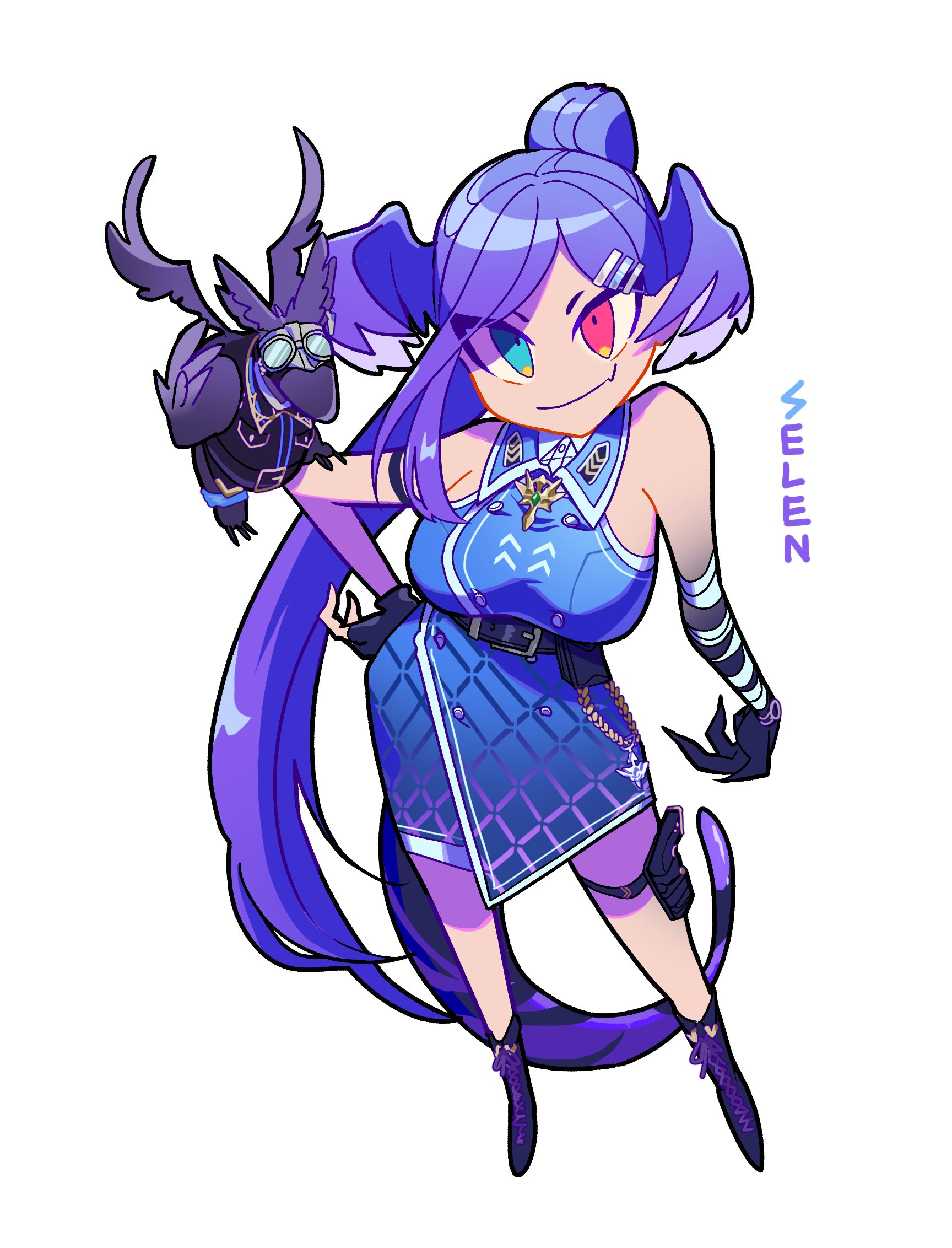 1girl asymmetrical_arms belt blue_dress blue_eyes boots breasts character_name closed_mouth dress ember_(selen_tatsuki) head_wings heterochromia highres large_breasts long_hair looking_at_viewer nijisanji nijisanji_en purple_hair red_eyes selen_tatsuki selen_tatsuki_(military) simple_background sleeveless sleeveless_dress smile standing tail usual_(usual_1200) very_long_hair virtual_youtuber white_background wings