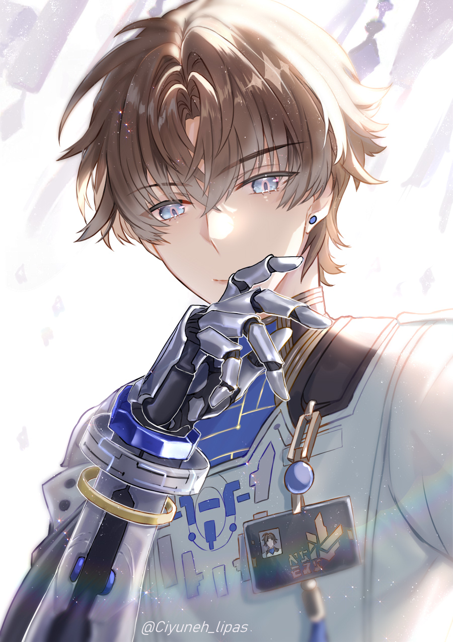 1boy blue_eyes brown_hair ciyuneh_lipas closed_mouth coat commentary earrings english_commentary hair_between_eyes hand_up highres id_card jewelry looking_at_viewer male_focus mechanical_arms mechanical_hands parted_bangs short_hair smile solo stud_earrings twitter_username upper_body white_coat wuthering_waves xiangli_yao_(wuthering_waves)