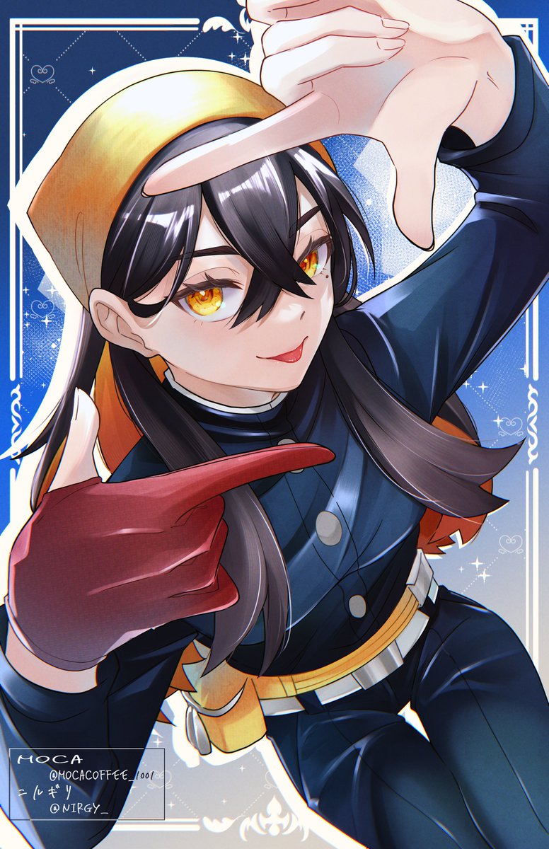 1girl :p artist_collaboration artist_name black_hair blue_jacket blue_pants blueberry_academy_school_uniform carmine_(pokemon) colored_inner_hair commentary_request crossed_bangs eyelashes fanny_pack finger_frame gloves hair_between_eyes hairband highres jacket long_hair long_sleeves looking_at_viewer mocacoffee_1001 mole mole_under_eye multicolored_hair nintendo nirugiri_(nirgy) pants partially_fingerless_gloves pokemon pokemon_scarlet_and_violet red_gloves red_hair school_uniform single_glove solo tongue tongue_out twitter_username two-tone_hair yellow_eyes yellow_hairband