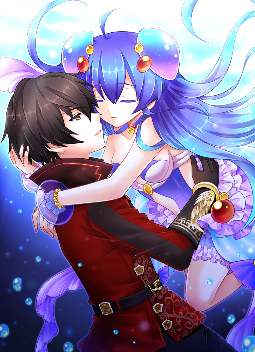 1boy 1girl air_bubble belt black_gloves black_hair blue_hair bracelet breasts bubble closed_eyes clothing_cutout collared_shirt dress frilled_dress frills fugenpo gloves gradient_clothes gradient_dress jewelry navel_cutout nemo_(shironeko_project) noa_(shironeko_project) shironeko_project shirt small_breasts underwater yellow_eyes