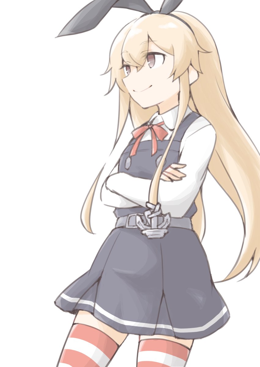 1girl akara_kai asashio_(kancolle) asashio_(kancolle)_(cosplay) asashio_kai_ni_(kancolle) asashio_kai_ni_(kancolle)_(cosplay) belt blonde_hair blush brown_eyes cosplay crossed_arms dress hairband highres kantai_collection long_hair long_sleeves looking_at_viewer neck_ribbon pinafore_dress red_ribbon red_thighhighs ribbon school_uniform shimakaze_(kancolle) shirt simple_background sleeveless sleeveless_dress smile solo striped_clothes striped_thighhighs thighhighs white_background white_shirt white_thighhighs