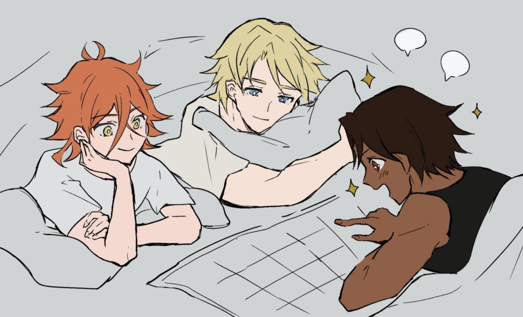 3boys alternate_costume antenna_hair black_hair blonde_hair blue_eyes bunet_(fire_emblem) dark-skinned_male dark_skin fire_emblem fire_emblem_engage fogado_(fire_emblem) highres messy_hair multiple_boys nintendo oda32t orange_hair pandreo_(fire_emblem) sleepover speech_bubble yellow_eyes
