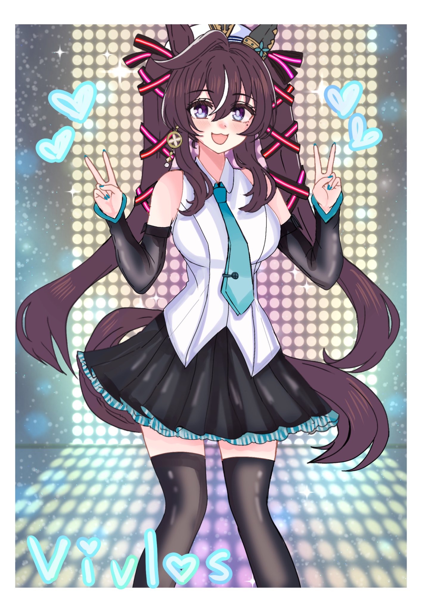 1girl animal_ears b9pqpy beret blush breasts brown_hair character_name commentary_request cosplay double_v earrings hair_ornament hat hatsune_miku hatsune_miku_(cosplay) highres horse_ears horse_girl jewelry looking_at_viewer medium_breasts purple_eyes single_earring solo stage thighhighs umamusume v vivlos_(umamusume) vocaloid