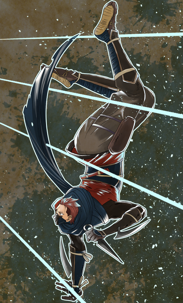 1boy fire_emblem fire_emblem_fates handstand japanese_clothes kunai male_focus mask mouth_mask ninja ninja_mask nintendo one_arm_handstand one_eye_closed red_eyes red_hair saizo_(fire_emblem) scar scar_across_eye scar_on_face scarf solo weapon yokokisa