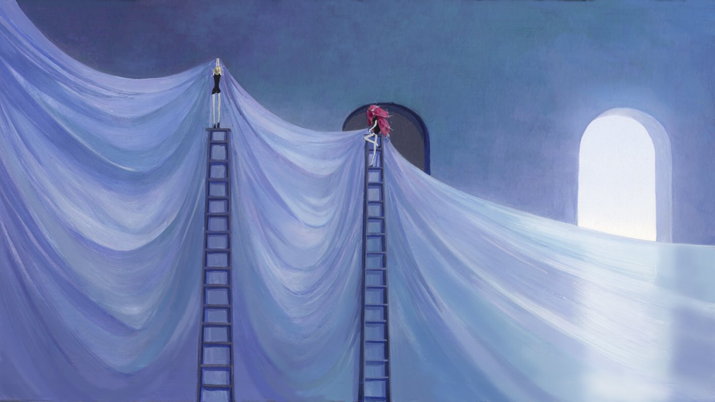 2others bike_shorts black_footwear black_jacket black_shorts curtains end_card gem_uniform_(houseki_no_kuni) houseki_no_kuni indoors jacket ladder morganite_(houseki_no_kuni) multiple_others nishikawa_youichi official_art on_ladder see-through_curtains shorts window yellow_diamond_(houseki_no_kuni)
