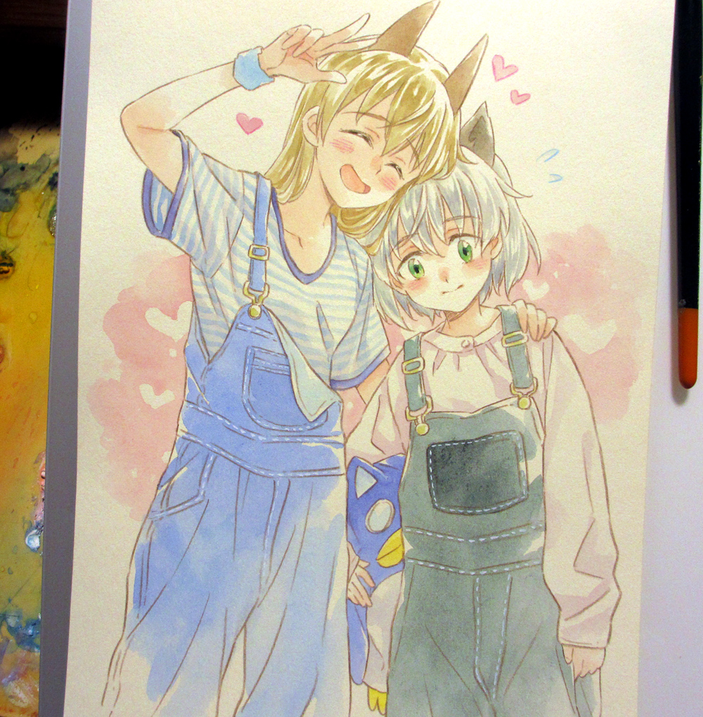 2girls agahari blonde_hair blush closed_mouth commentary_request eila_ilmatar_juutilainen heart long_sleeves multiple_girls open_mouth overalls painting_(medium) photo_(medium) sanya_v._litvyak shirt smile strike_witches striped_clothes striped_shirt stuffed_animal stuffed_penguin stuffed_toy sweat traditional_media v watercolor_(medium) white_hair white_shirt world_witches_series yuri