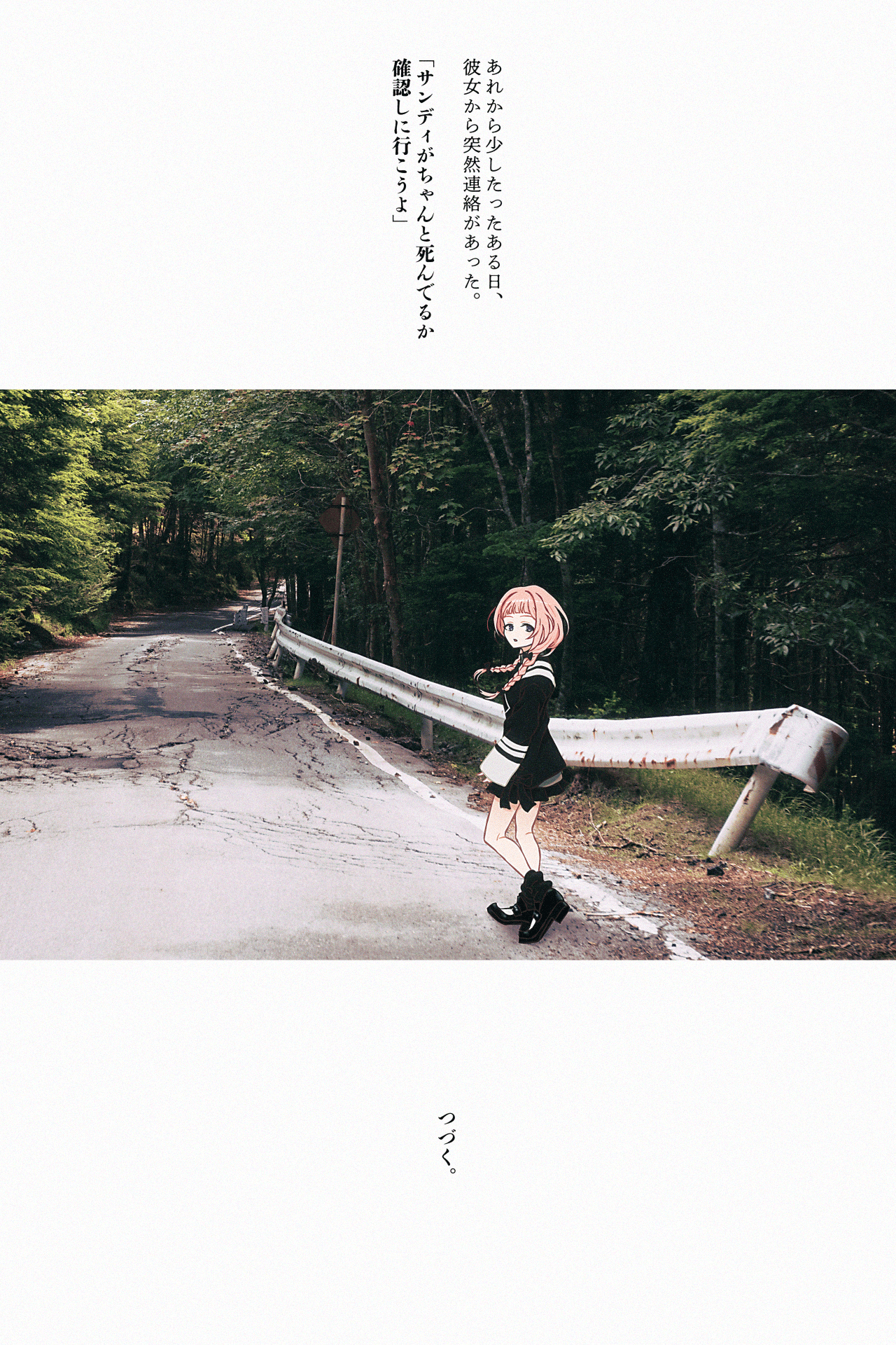 1girl :o black_bow black_serafuku black_shirt black_shoes black_skirt blue_eyes bow braid day dirt forest from_behind guard_rail hair_bow highres loafers long_hair long_sleeves looking_at_viewer low_twin_braids miniskirt nature nijisanji nkymyura open_mouth outdoors photo_background pink_hair pleated_skirt road sailor_collar school_uniform serafuku shirt shoes short_bangs sign skirt sleeve_cuffs sleeves_past_wrists solo suo_sango translation_request tree twin_braids virtual_youtuber walking white_sailor_collar wide_shot