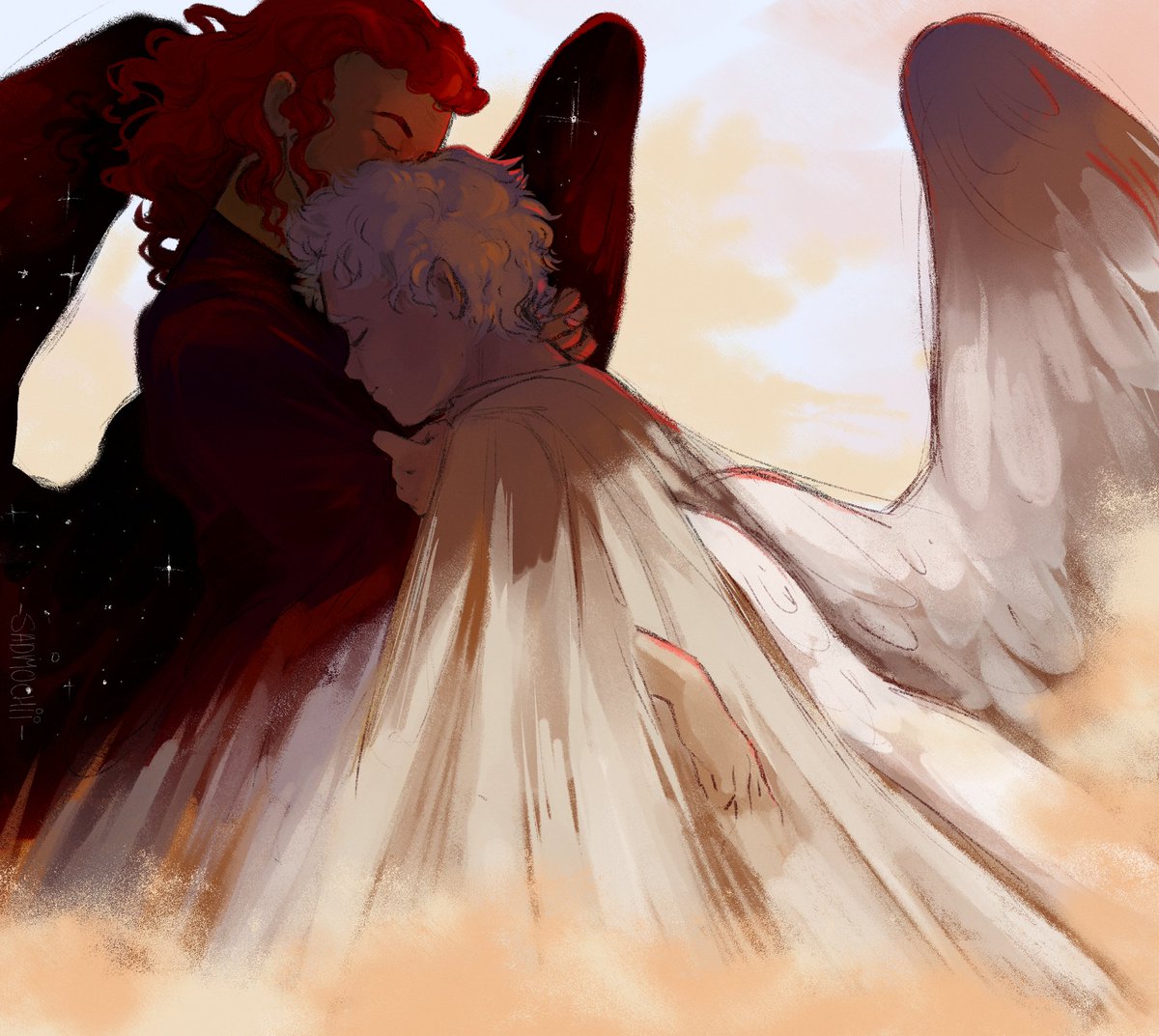 2boys artist_request aziraphale_(good_omens) bad_link bad_vk_link black_robe black_wings crowley_(good_omens) feathered_wings golden_hour good_omens hug multiple_boys red_hair robe white_hair white_robe white_wings wings