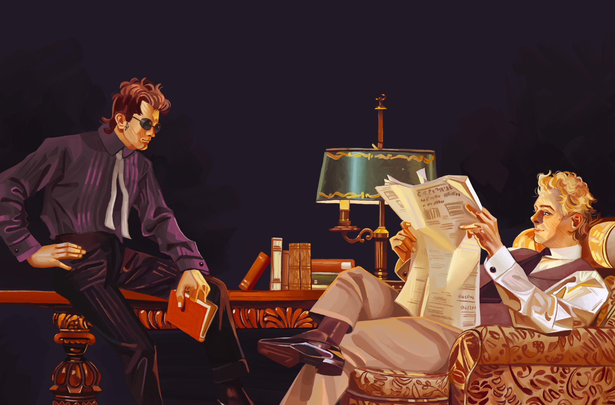 2boys angel aziraphale_(good_omens) c0rvidski crowley_(good_omens) demon_boy good_omens highres holding holding_newspaper j._c._leyendecker_(style) looking_at_another men_reading_(leyendecker) multiple_boys newspaper reading red_hair short_hair sitting white_hair
