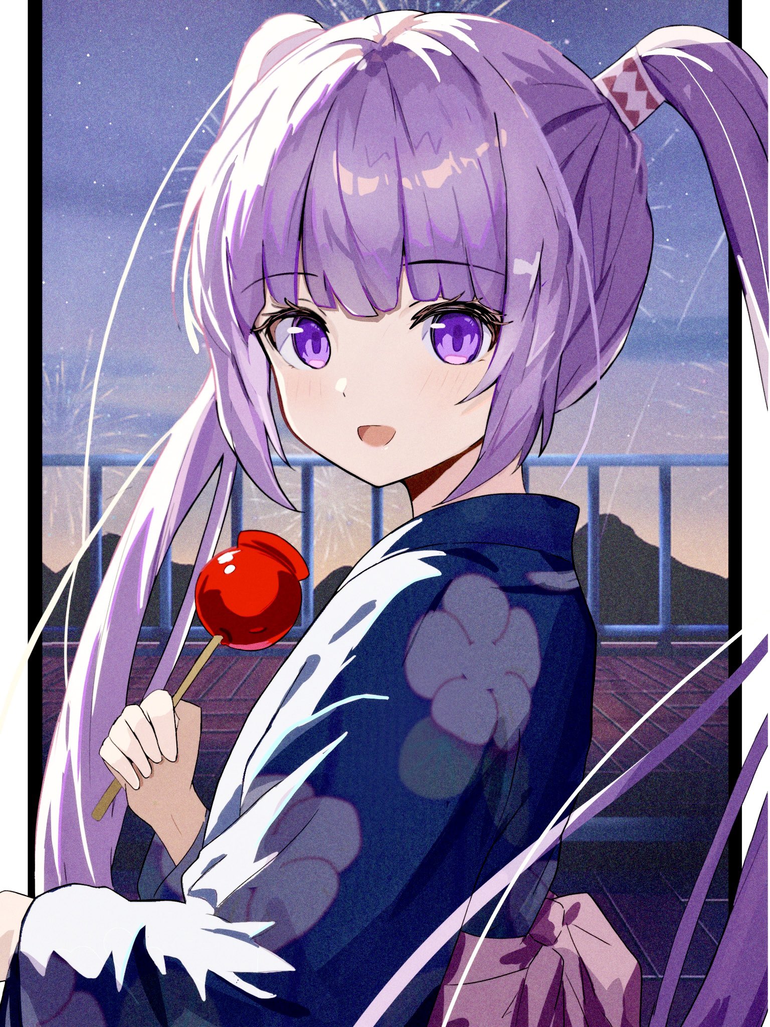 1girl 7wxhuxh :d candy candy_apple commentary_request dot_nose fence floral_print floral_print_kimono food highres holding holding_candy holding_candy_apple holding_food japanese_clothes kimono looking_at_viewer open_mouth outside_border pillarboxed print_kimono purple_eyes purple_hair smile solo sophie_(tales) tales_of_(series) tales_of_graces twintails
