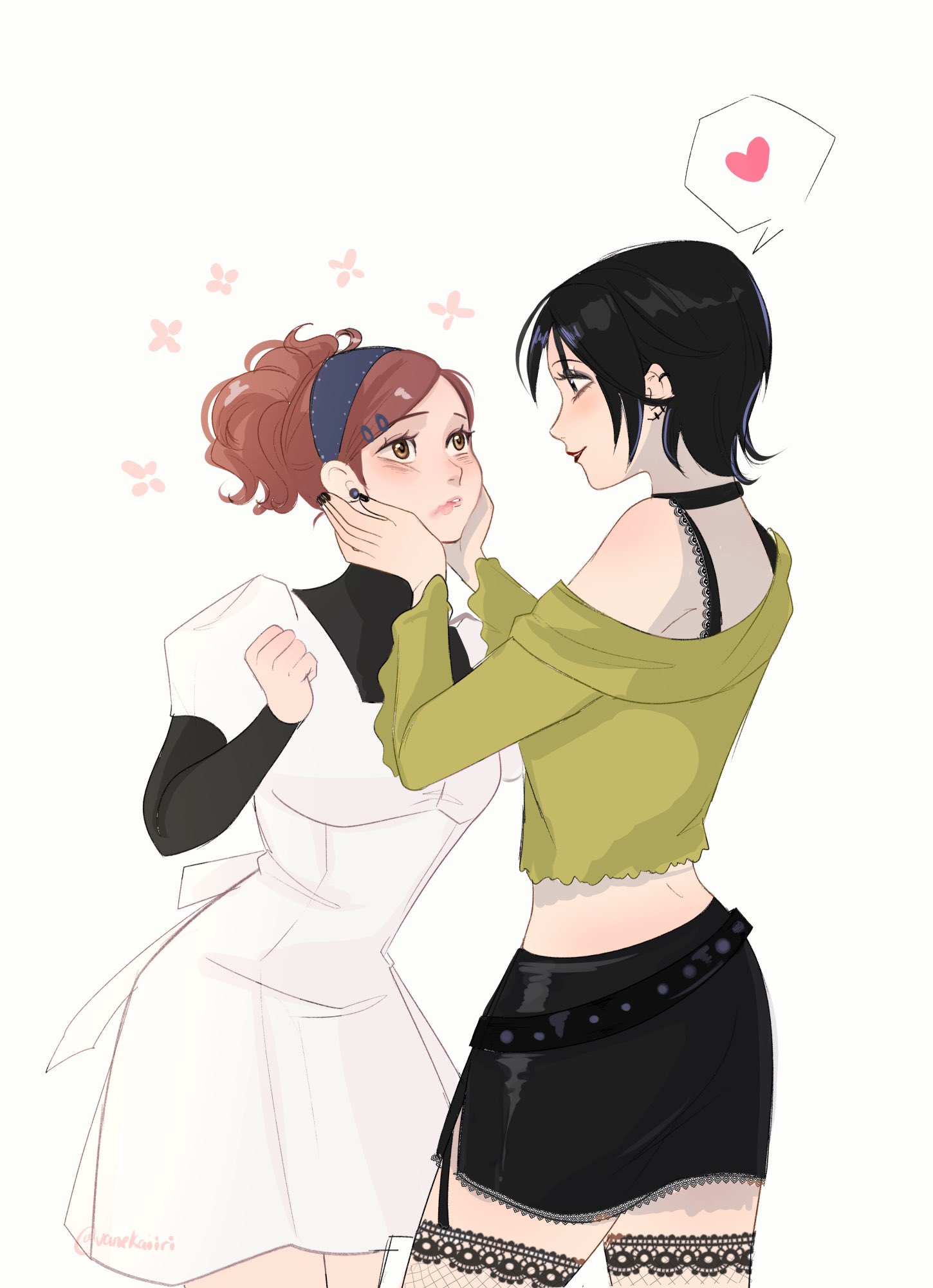 2girls belt black_belt black_bra black_footwear black_hair black_nails black_shirt black_skirt blue_hairband blush bra breasts brown_hair clenched_hands dress earrings fishnet_thighhighs fishnets garter_straps hair_ornament hairband hairclip hands_on_another's_cheeks hands_on_another's_face heart highres jewelry komatsu_nana medium_breasts midriff miniskirt multiple_girls nail_polish nana_(series) off-shoulder_sweater off_shoulder osaki_nana ponytail shirt shirt_under_dress short_dress short_hair side_slit skirt smile spoken_heart studded_belt sweater thighhighs twitter_username underwear updo vanekairi white_background white_dress yellow_sweater yuri