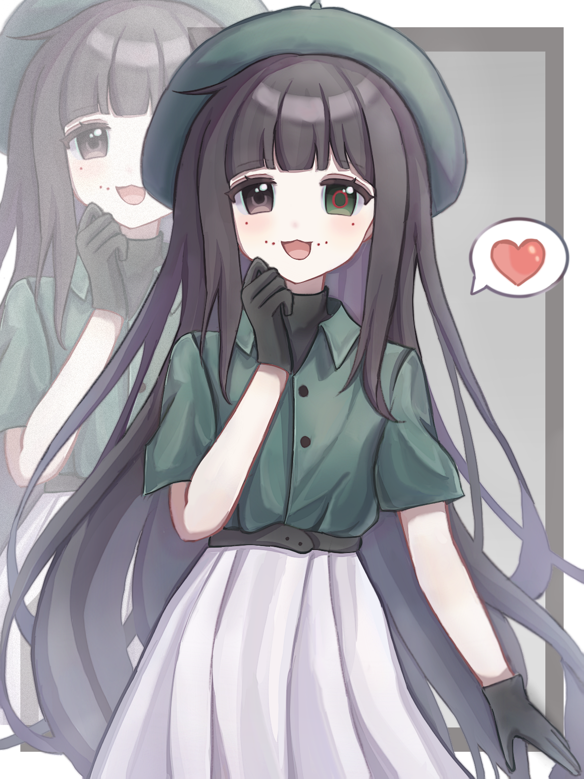1girl :3 belt beret black_belt black_eyes black_gloves black_hair blunt_bangs collared_shirt commentary cowboy_shot facial_mark gloves green_eyes green_hat green_shirt hat heart heterochromia highres long_hair mofa_maomao naihe_(female)_(touqi_guaitan) open_mouth pleated_skirt shirt short_sleeves skirt smile solo speech_bubble spoken_heart untranslatable_commentary touqi_guaitan white_skirt zoom_layer