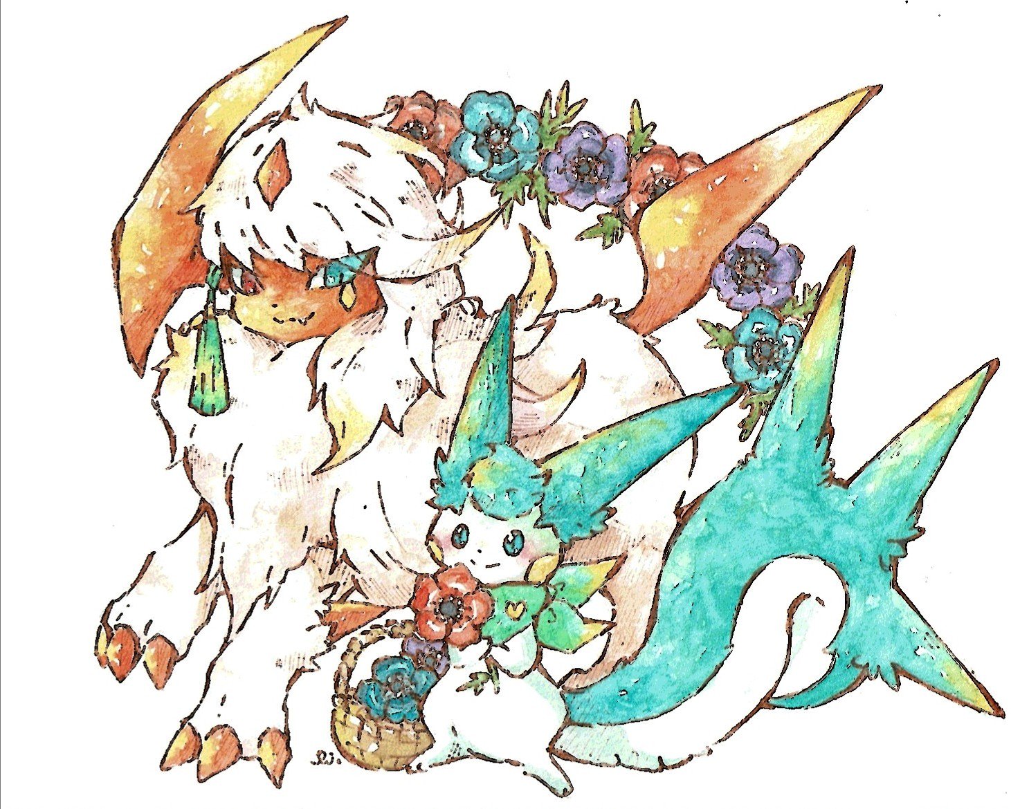 2others absol basket blue_eyes blue_fur colored_skin fangs flower gen_3_pokemon gen_4_pokemon green_scarf heterochromia holding holding_flower looking_at_another multiple_others nintendo pachirisu pokemon pokemon_(creature) rai_(rai_kw) red_claws red_skin scarf skin_fangs white_fur