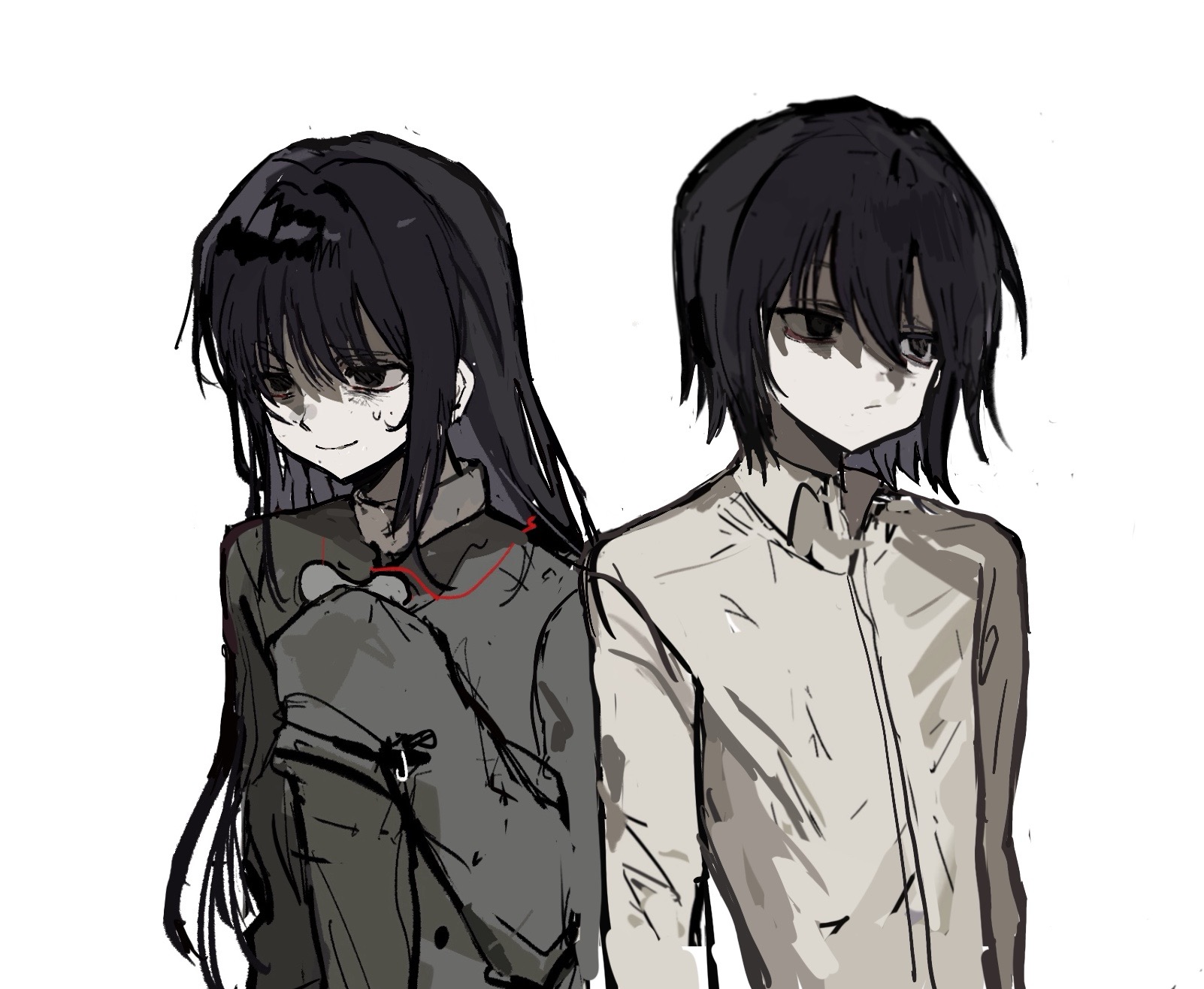 2boys a_bo black_eyes black_hair black_shirt chinese_commentary closed_mouth collared_shirt commentary_request grey_shirt hair_between_eyes highres long_hair long_sleeves long_zhi_feng_di_renxin_poce male_focus meng_yuanyan mole mole_on_cheek mole_under_eye mole_under_mouth multiple_boys multiple_moles pale_skin shirt short_hair simple_background sketch sleeves_past_fingers sleeves_past_wrists smile sweat touqi_guaitan upper_body white_background
