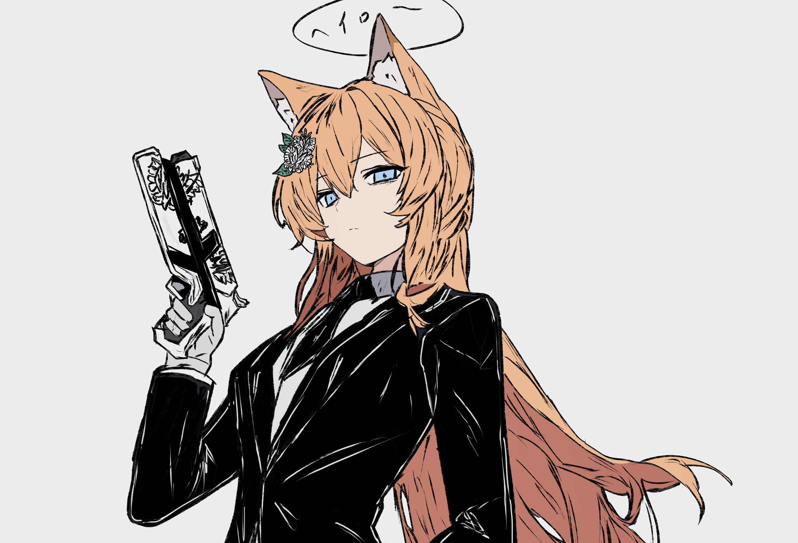 1girl 218_(niiya) alternate_costume animal_ear_fluff animal_ears blue_archive blue_eyes e.g.o_(project_moon) funeral_of_the_dead_butterflies gun halo handgun highres holding holding_gun holding_weapon library_of_ruina limbus_company mari_(blue_archive) orange_hair project_moon simple_background solemn_lament_(e.g.o) solo upper_body weapon white_background yellow_halo