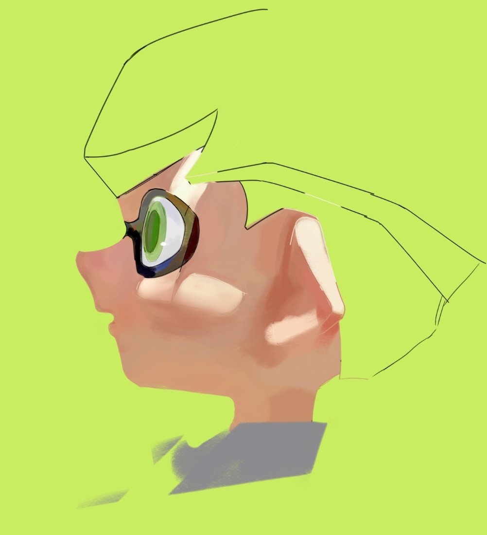 1boy blending from_side green_background green_eyes green_hair inkling inkling_boy inkling_player_character male_focus nintendo open_mouth ouoxz0t881876 pointy_ears short_hair simple_background solo splatoon_(series) tentacle_hair upper_body