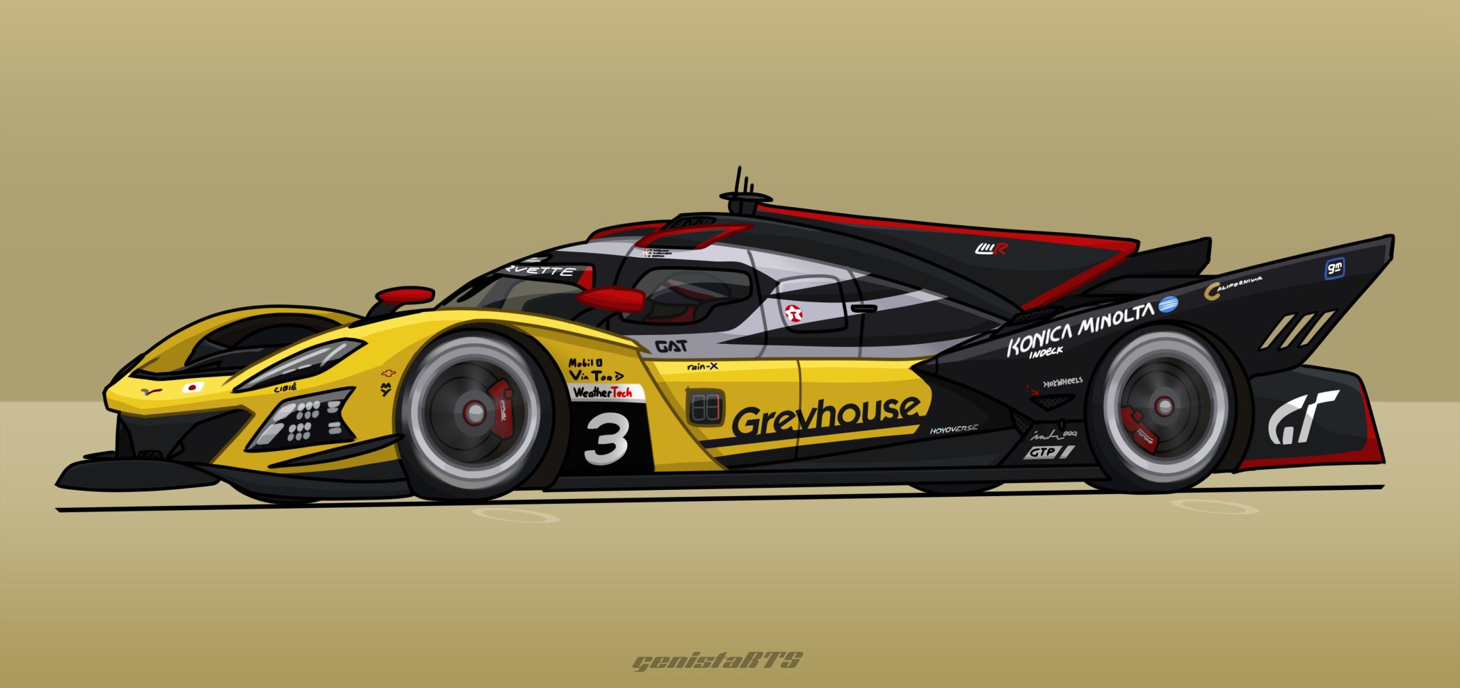 brown_background car chevrolet chevrolet_corvette chevrolet_corvette_c8 commentary english_commentary from_side gran_turismo highres imsa_sportscar_championship japanese_flag le_mans_prototype logo mei_(genistarts) motor_vehicle original race_vehicle racecar redesign shadow sponsor star_(symbol) vehicle_focus
