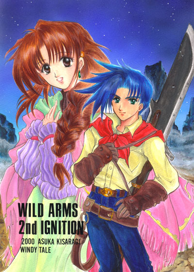 ahoge ashley_winchester asuka_kisaragi bayonet belt blue_hair braid brown_eyes brown_hair canyon copyright_name denim dress earrings elbow_gloves gloves green_eyes hair_over_shoulder hand_on_own_hip hip_focus jeans jewelry long_hair marina_irington night pants scarf shawl shirt smile sweater weapon wild_arms wild_arms_2