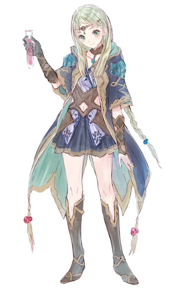 1girl atelier_(series) atelier_lulua blonde_hair blue_coat blue_dress boots braid brown_boots circlet closed_mouth coat dress full_body gloves green_eyes hand_up holding holding_test_tube kishida_mel knee_boots long_hair long_sleeves looking_at_viewer navel official_art piana_(atelier) simple_background smile solo standing test_tube white_background