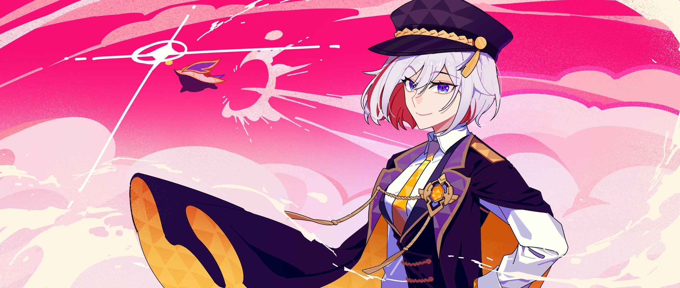 1girl black_hat black_jacket black_vest blue_eyes breasts closed_mouth cloud cloudy_sky collared_shirt creature formal_clothes grey_hair hair_between_eyes hand_on_own_hip hat hat_ornament highres honkai:_star_rail honkai_(series) jacket lapels long_sleeves looking_at_viewer medium_breasts multicolored_hair necktie numby_(honkai:_star_rail) official_alternate_costume open_clothes open_jacket orange_jacket outdoors pink_sky red_hair shirt short_hair sky smile standing suit tassel topaz_(honkai:_star_rail) topaz_(stoneheart's_oath_ring)_(honkai:_star_rail) trotter_(honkai:_star_rail) tuiqiao two-sided_fabric two-sided_jacket two-tone_hair vest white_shirt yellow_necktie