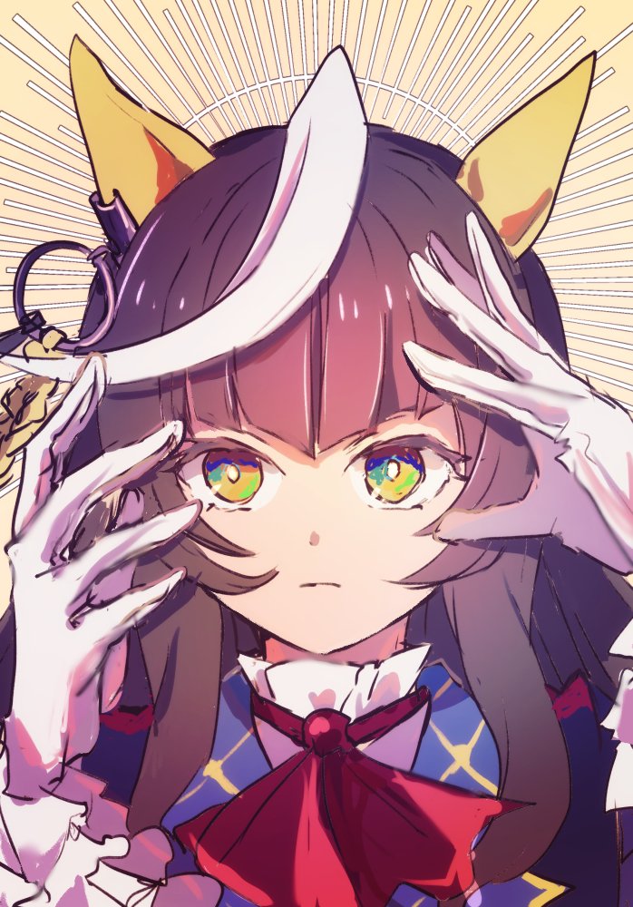 1girl animal_ears ascot black_hair calstone_light_o_(umamusume) ear_covers gloves hime_cut horse_ears horse_girl kobuta_(morino_kakuri) long_hair looking_at_viewer one-hour_drawing_challenge red_ascot solo striped_hair umamusume upper_body white_gloves yellow_eyes