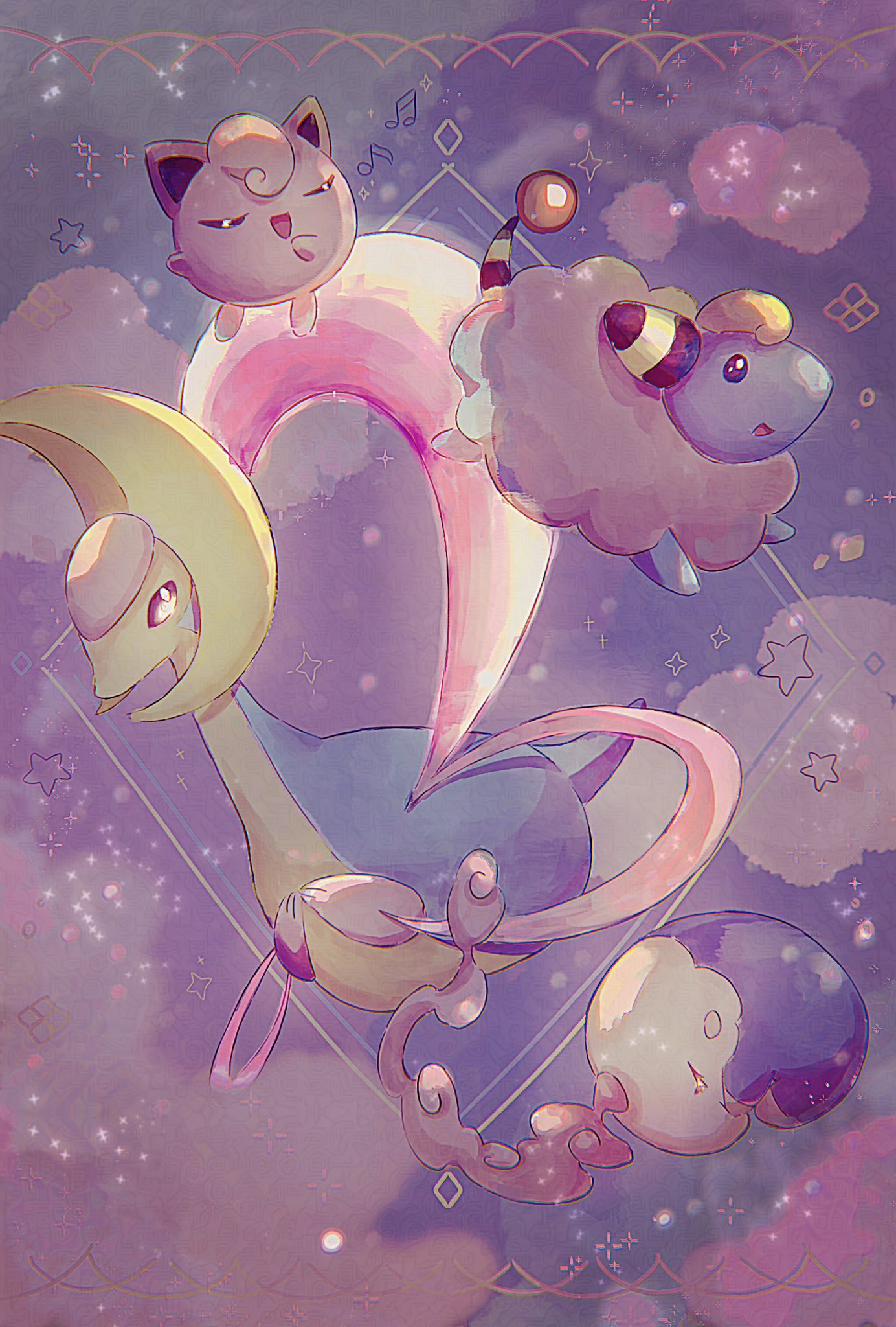ank836 baku_(creature) black_eyes blue_skin blush_stickers bright_pupils closed_eyes cloud colored_sclera colored_skin cresselia floating flying fog gas gen_1_pokemon gen_2_pokemon gen_4_pokemon highres horns jigglypuff legendary_pokemon mareep multicolored_skin music nintendo no_humans open_mouth pink_eyes pink_fur pink_sclera pink_skin pokemon pokemon_(creature) pokemon_focus purple_skin sheep short_tail singing solid_circle_eyes star_(sky) star_(symbol) tail two-tone_skin u_u white_pupils wool yellow_skin