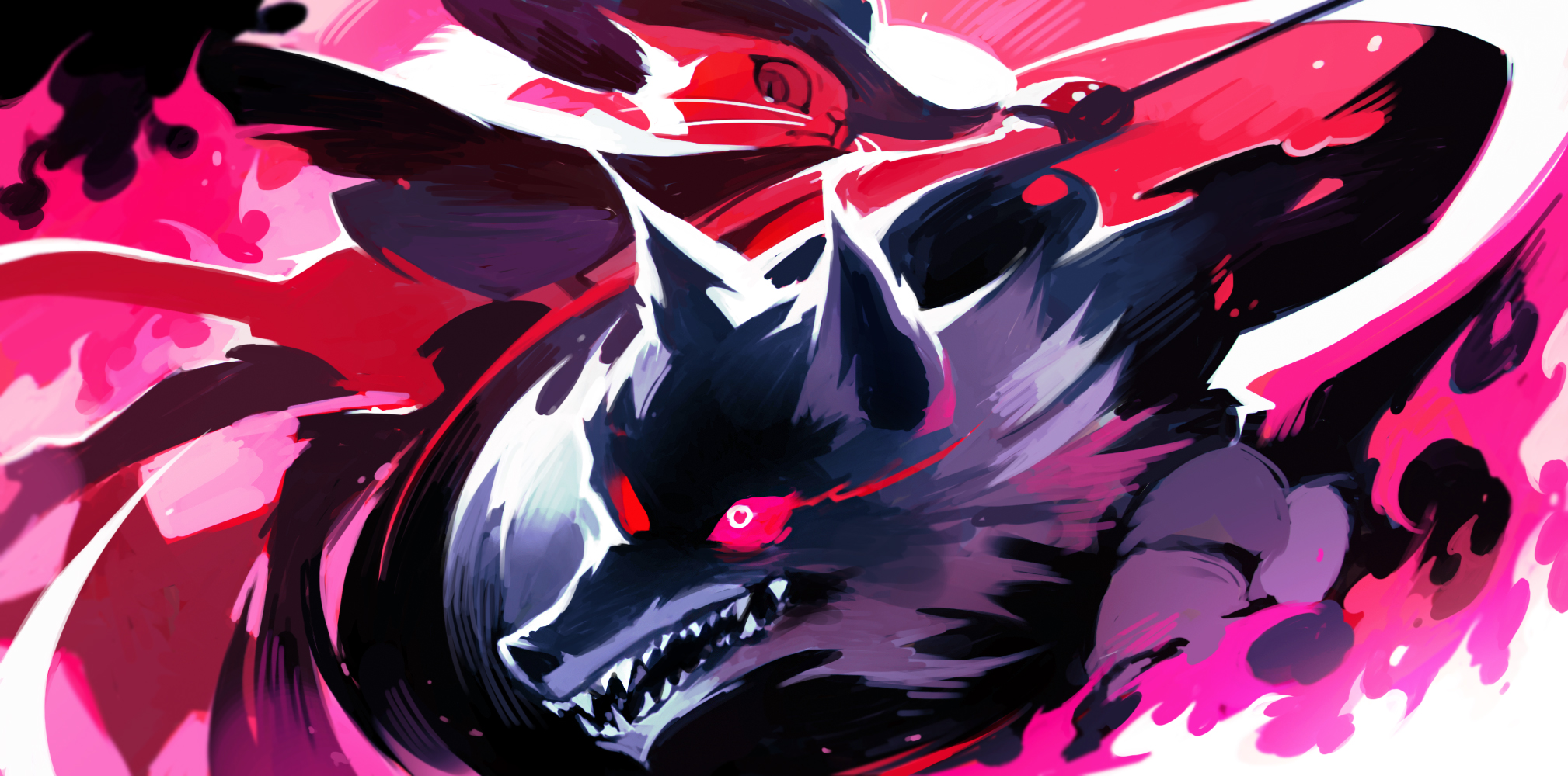 2boys animal_ears body_fur cape cat_boy cat_ears commentary death_(puss_in_boots) english_commentary furry furry_male glowing glowing_eyes hat highres holding holding_sword holding_weapon luminous_slime male_focus multiple_boys open_mouth puss_in_boots:_the_last_wish puss_in_boots_(shrek) rapier red_theme sharp_teeth shrek_(series) sword teeth weapon wolf_boy wolf_ears